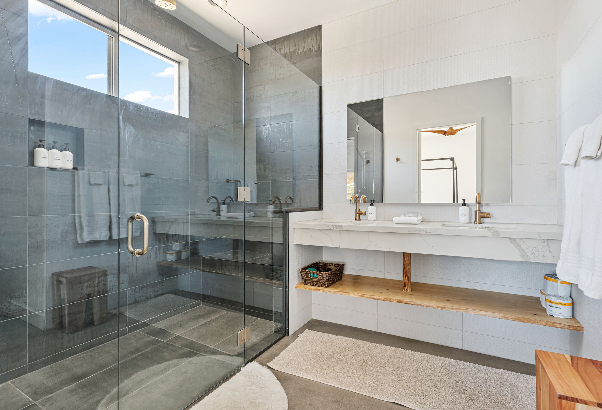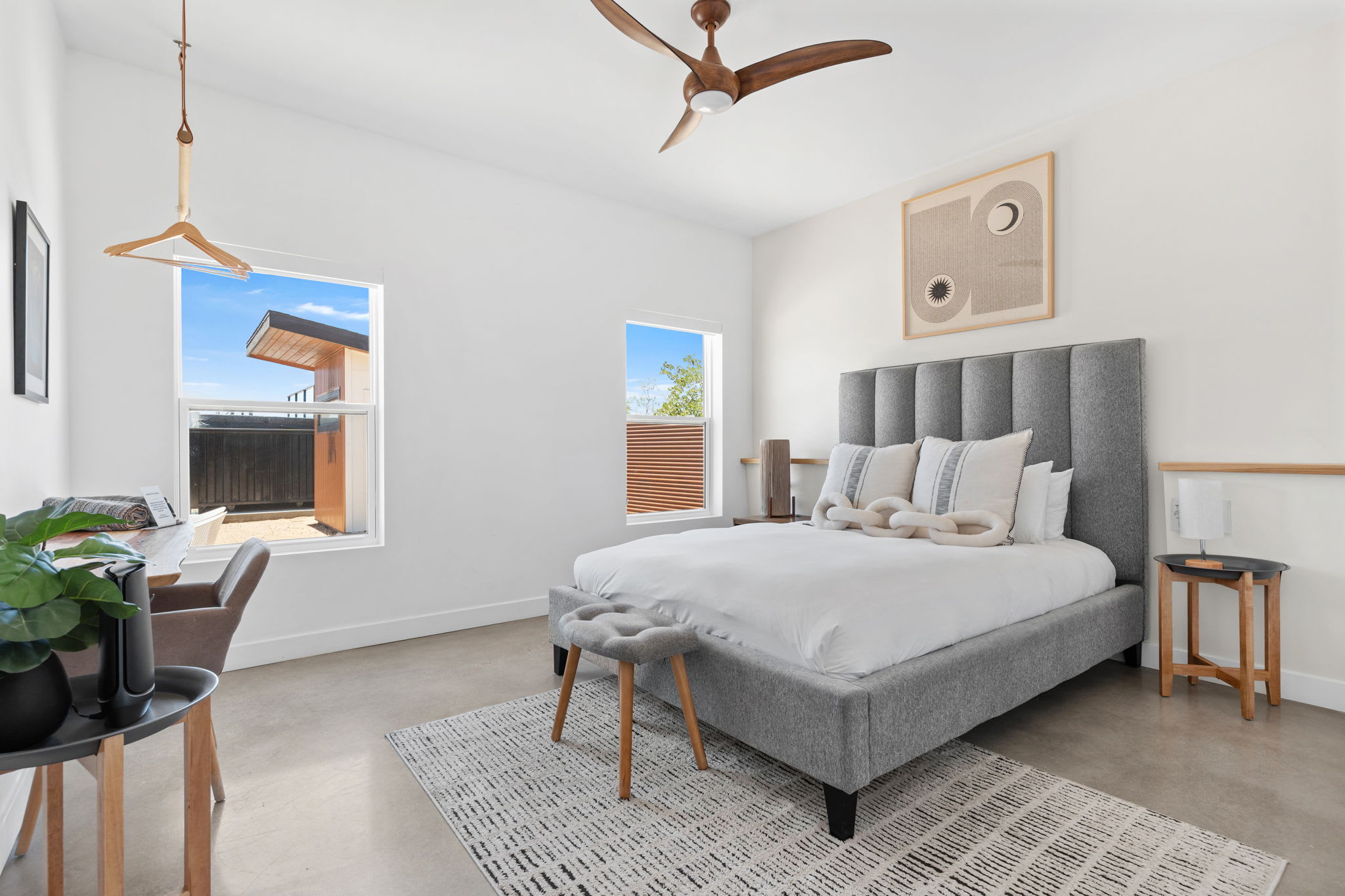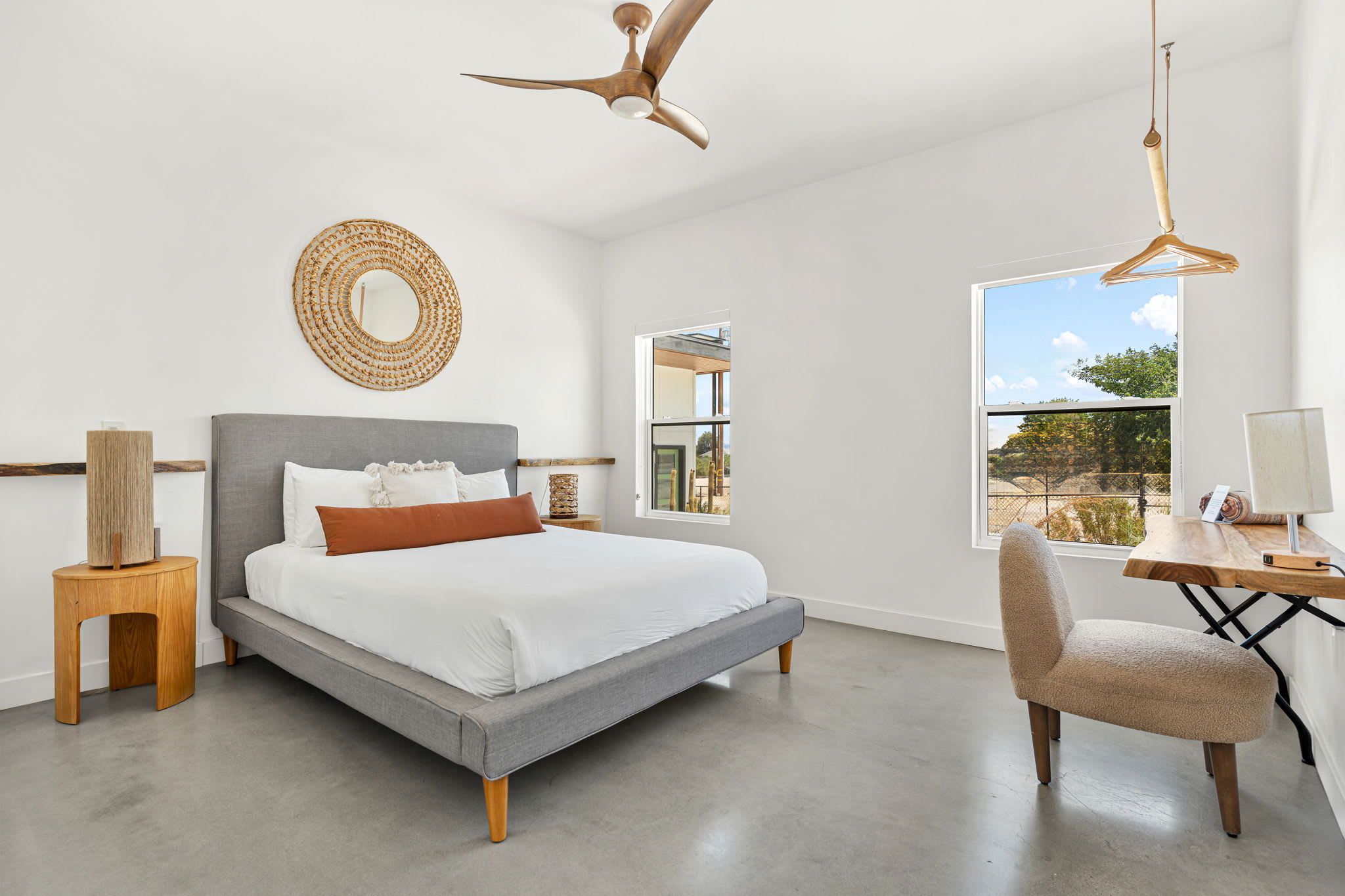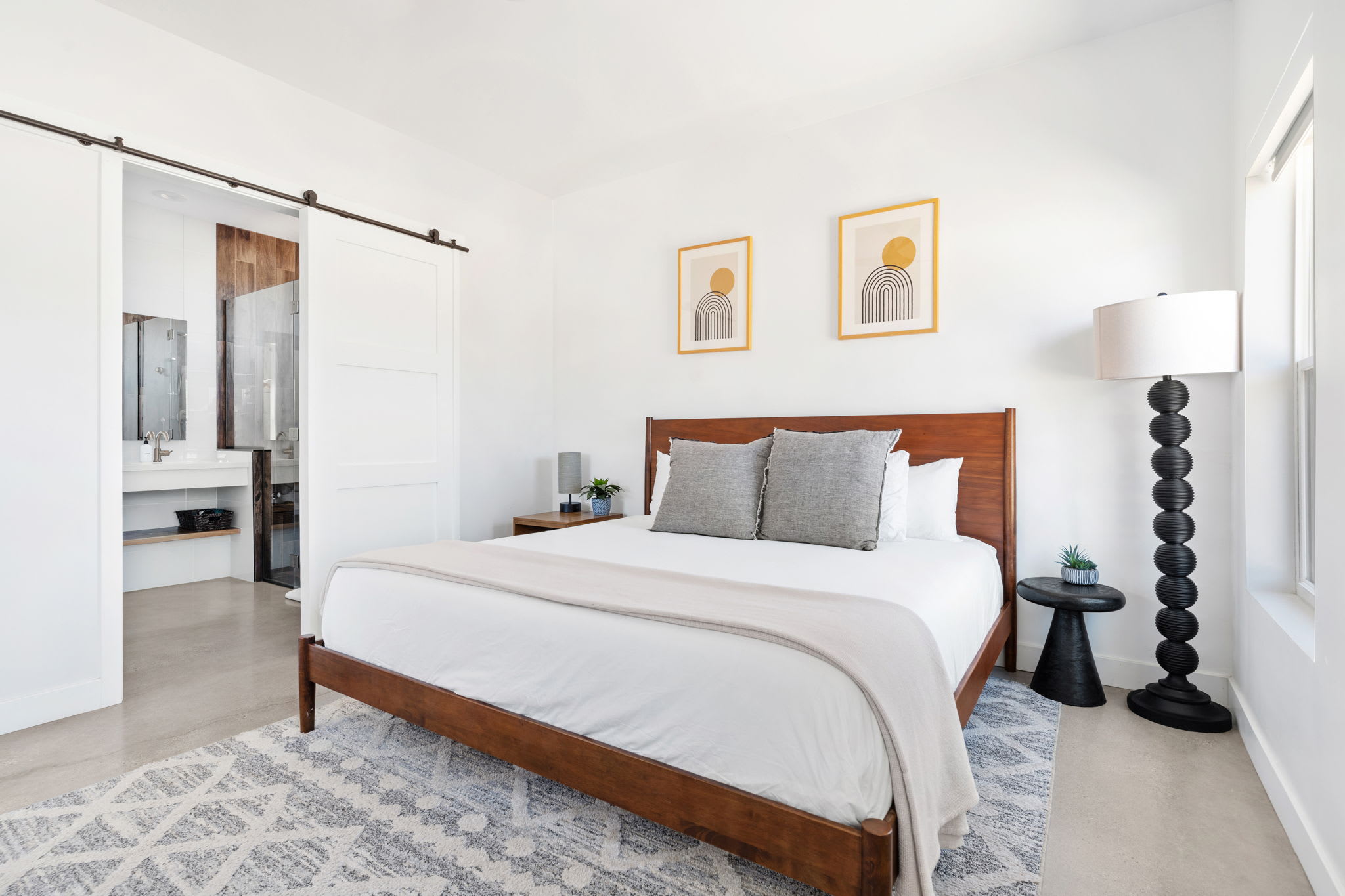 Primary Bedrooms (2 total) — Calm, spacious retreats in each home with en-suite bathrooms and modern desert styling.