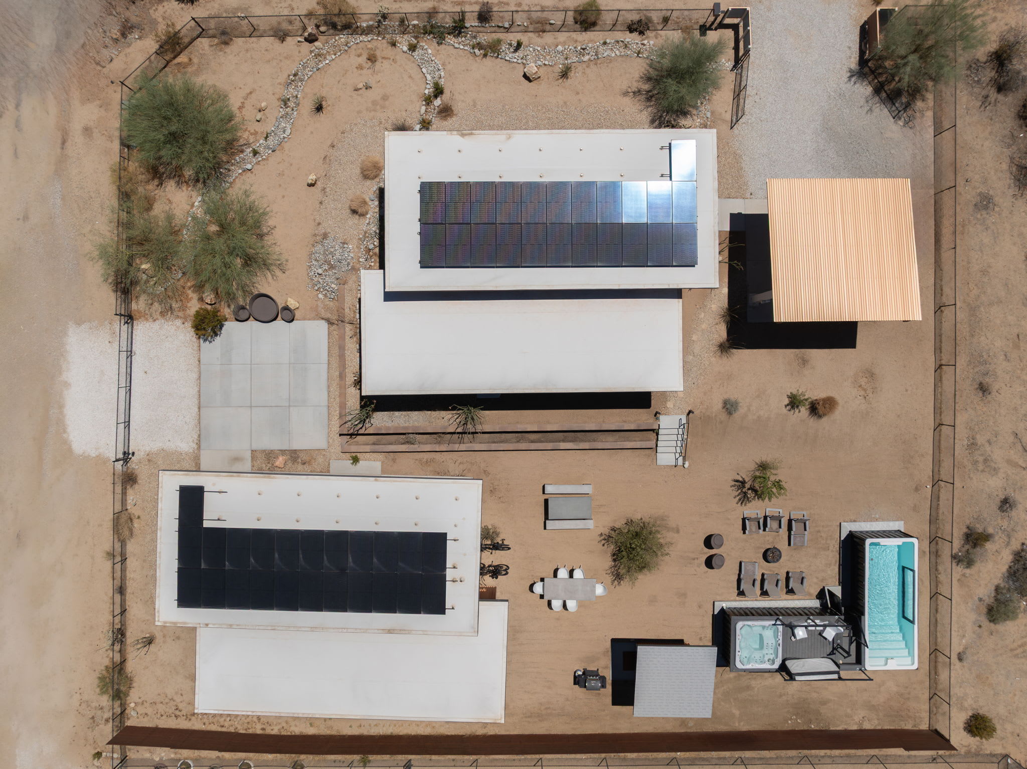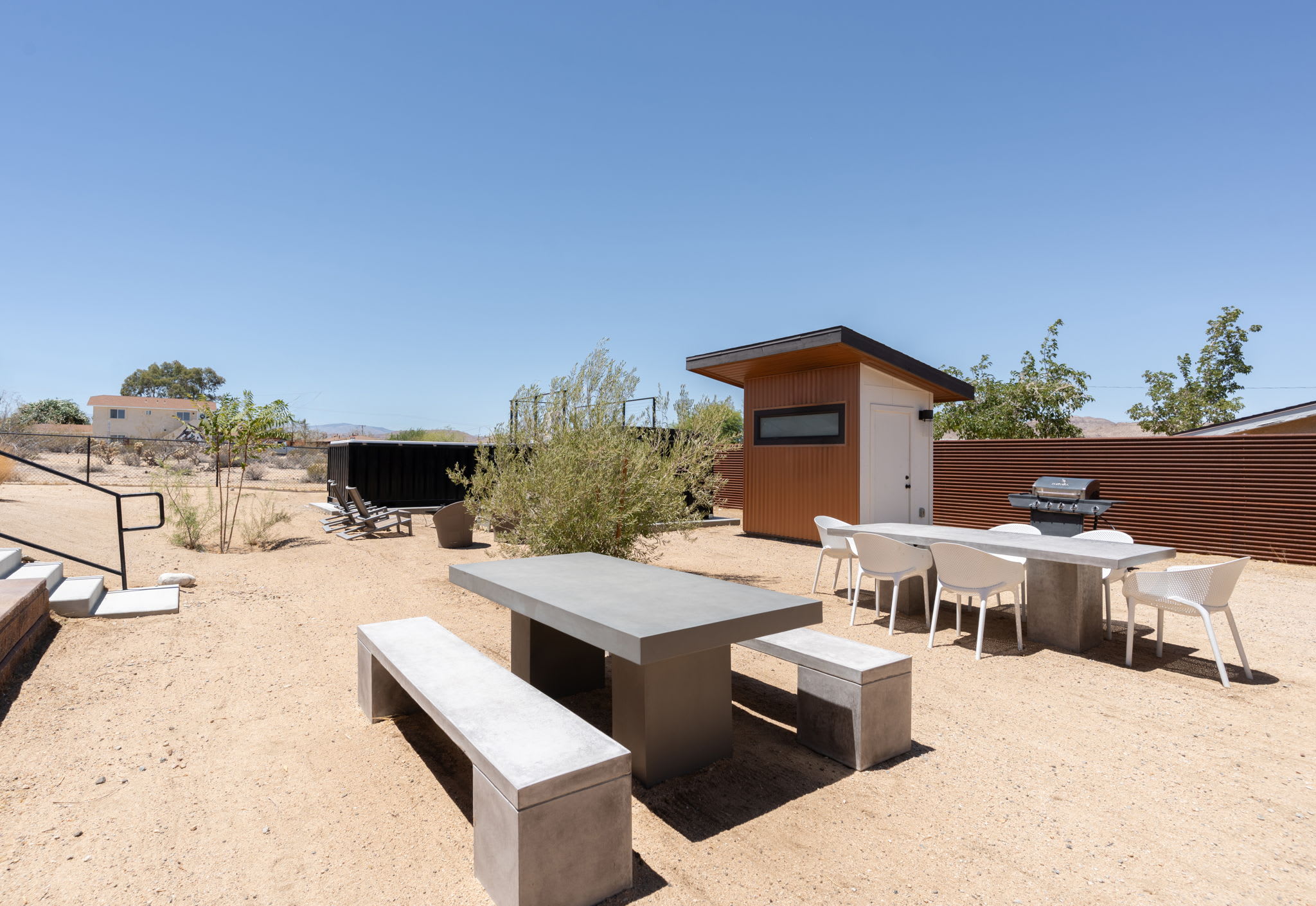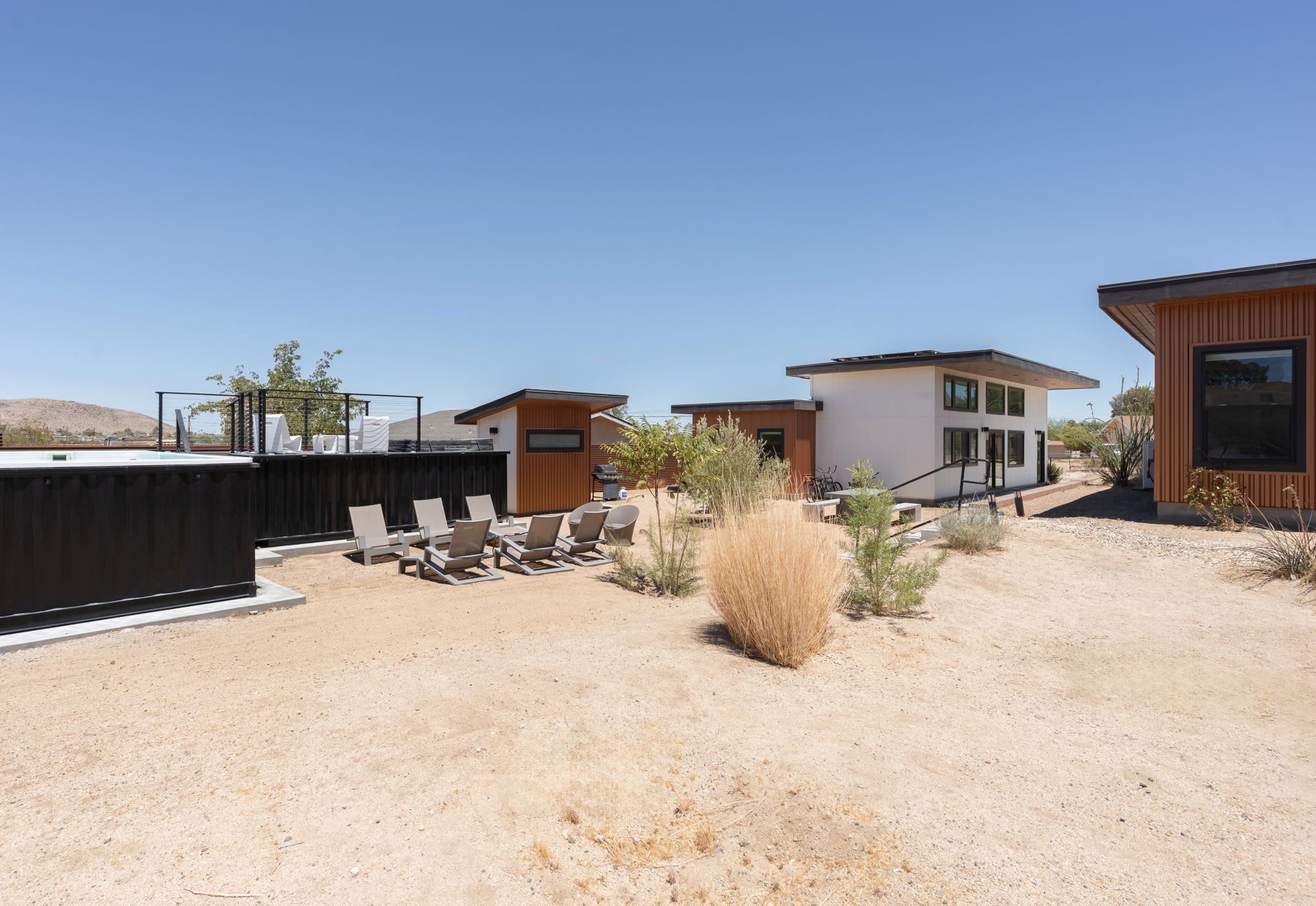 The courtyard functions as a private group-friendly oasis designed for gathering, sun, and stargazing.