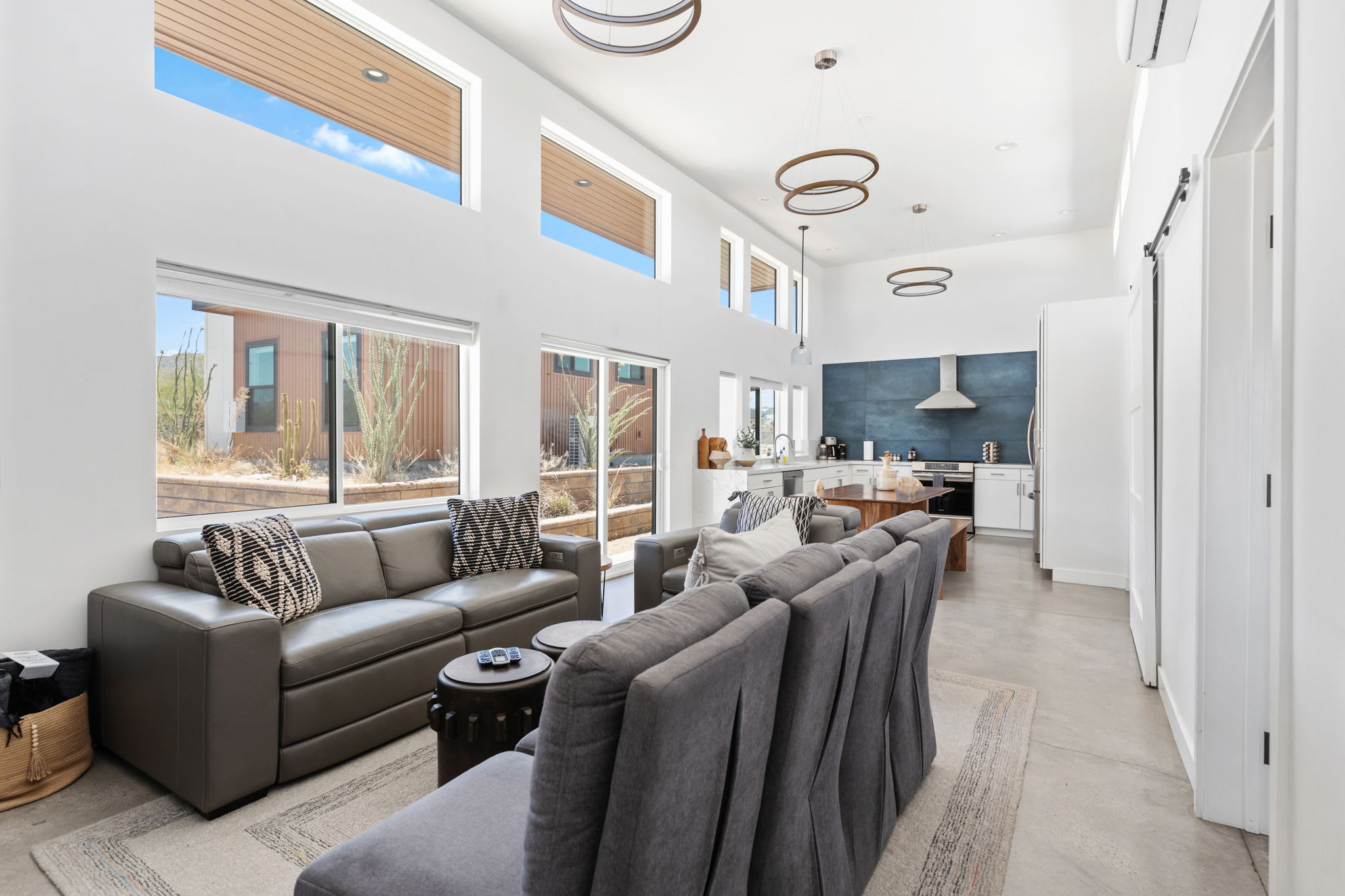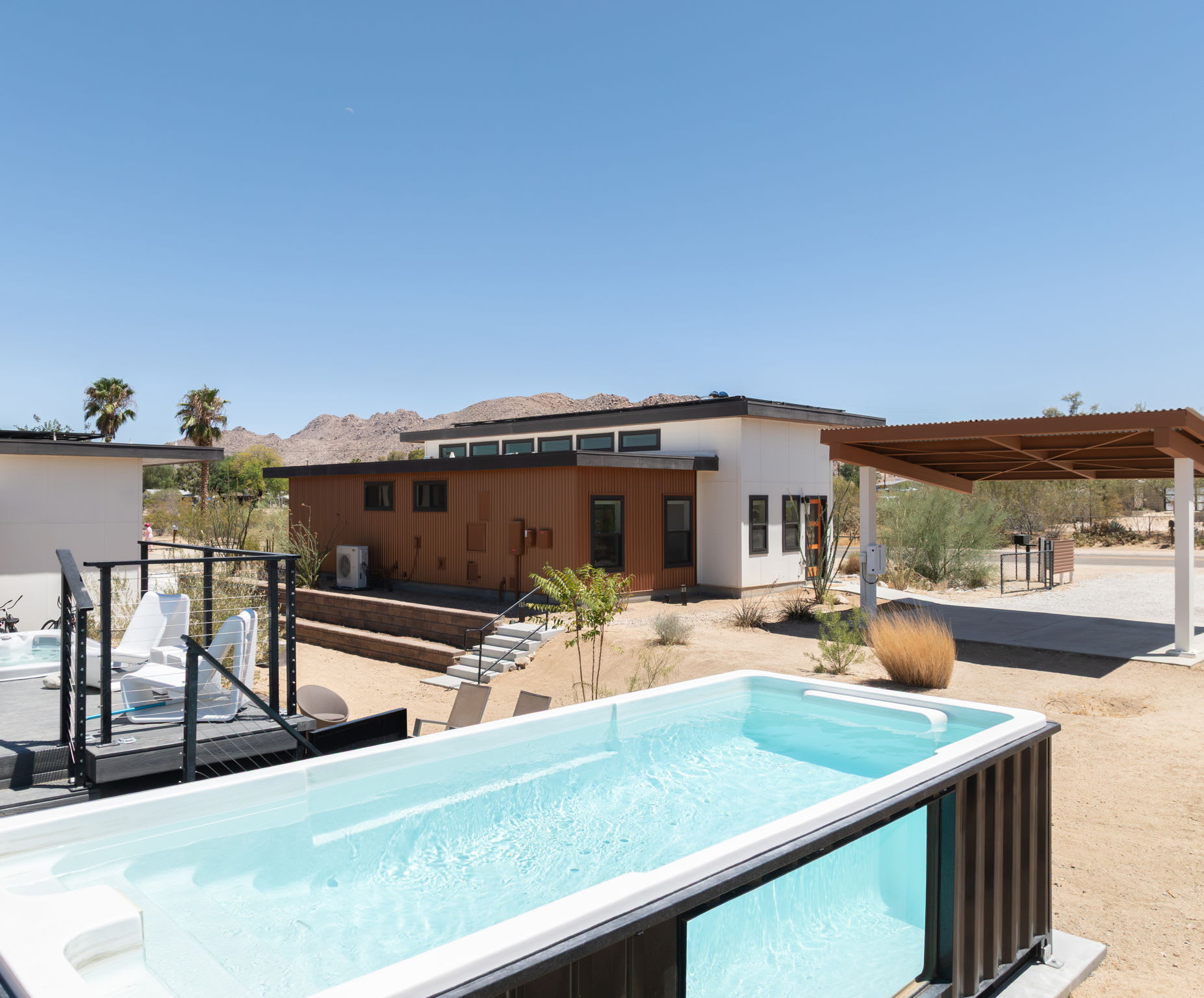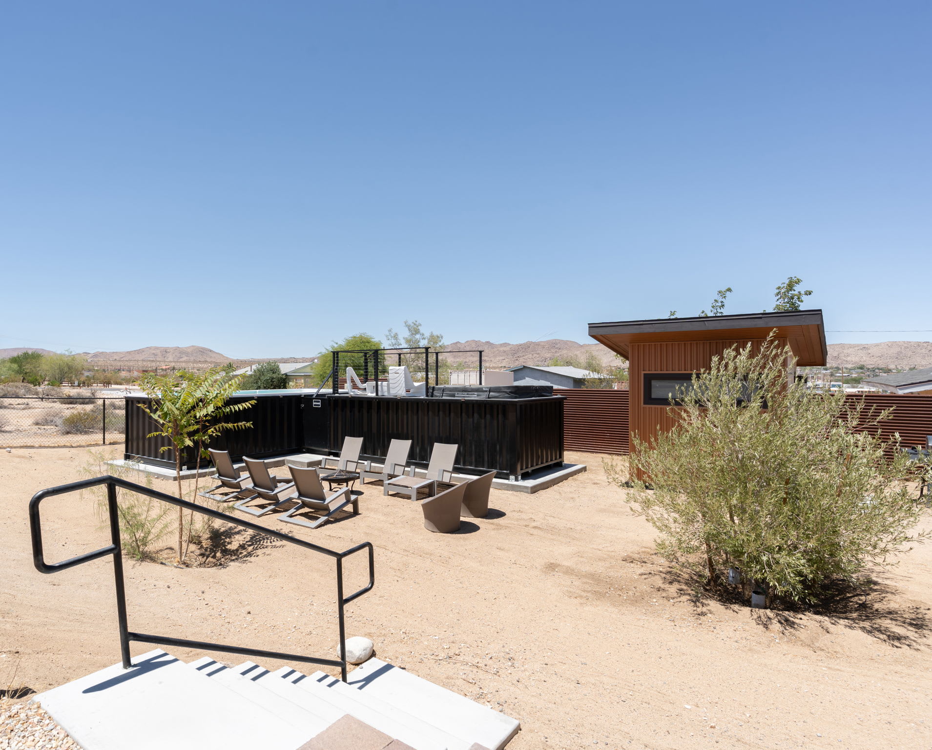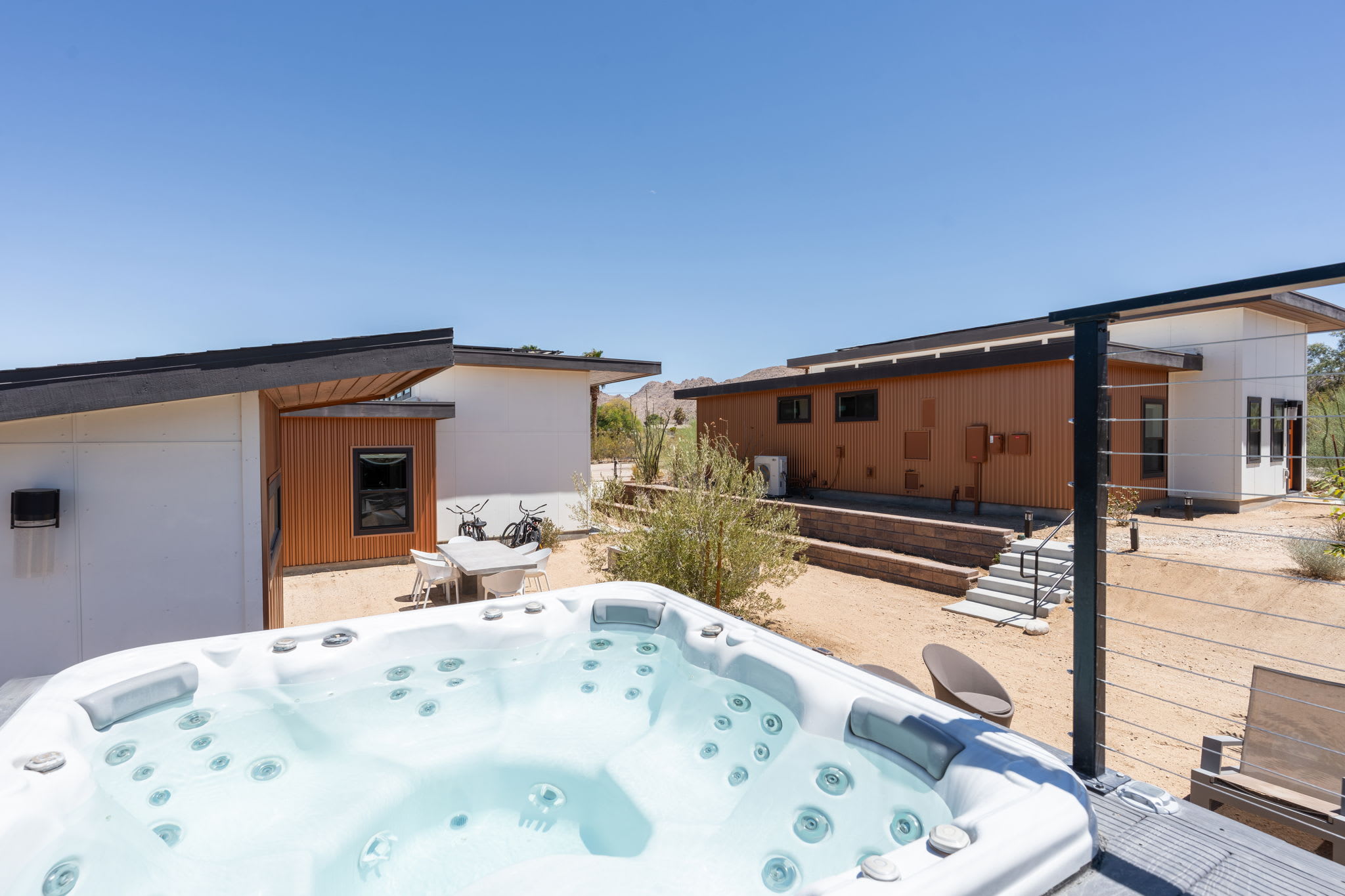 The courtyard functions as a private group-friendly oasis designed for gathering, sun, and stargazing.
