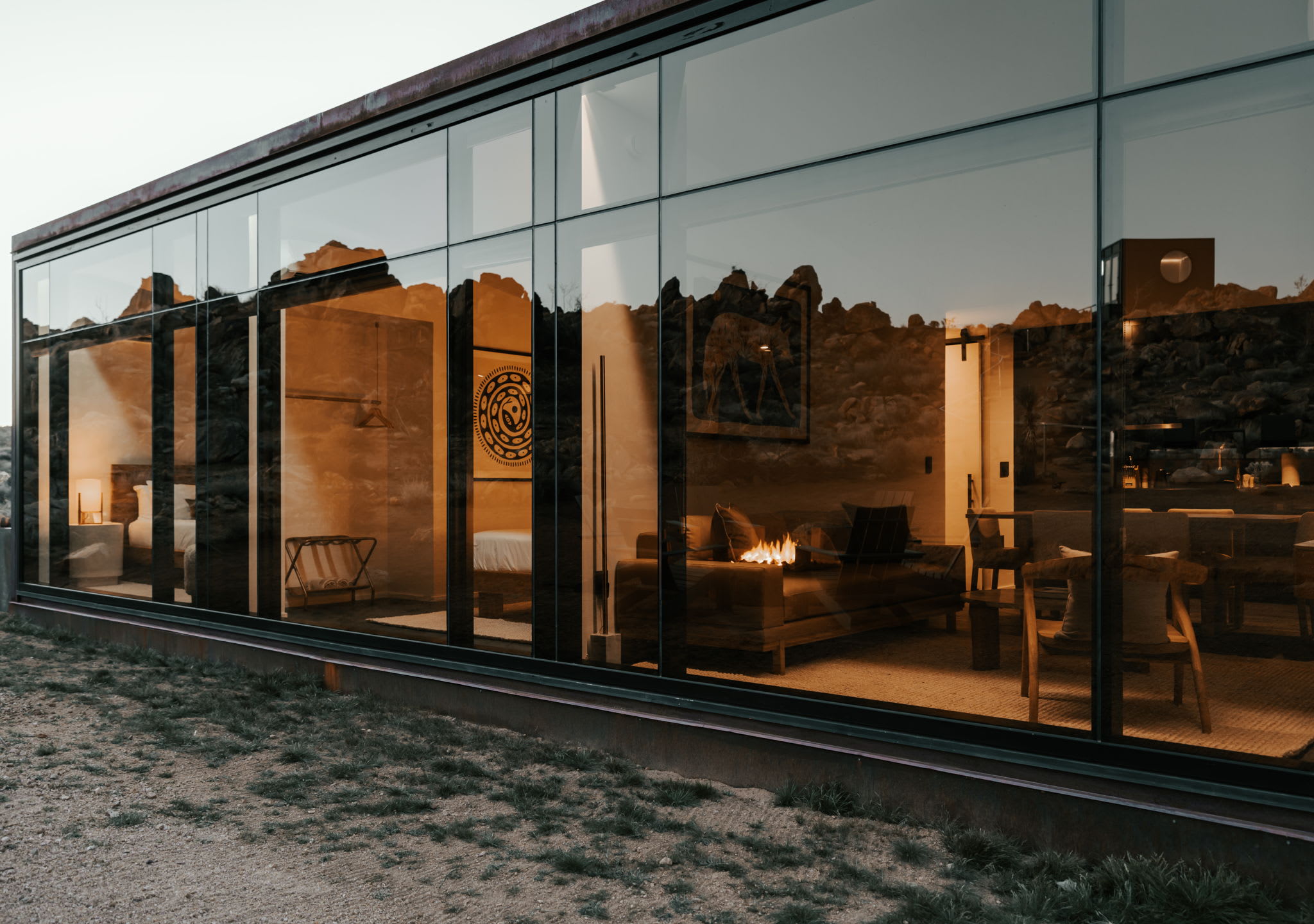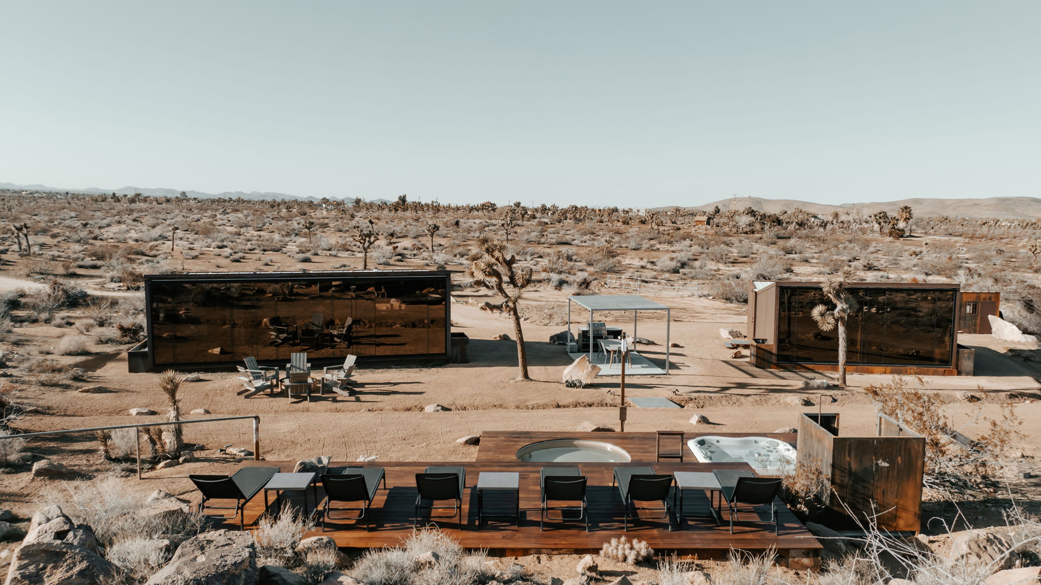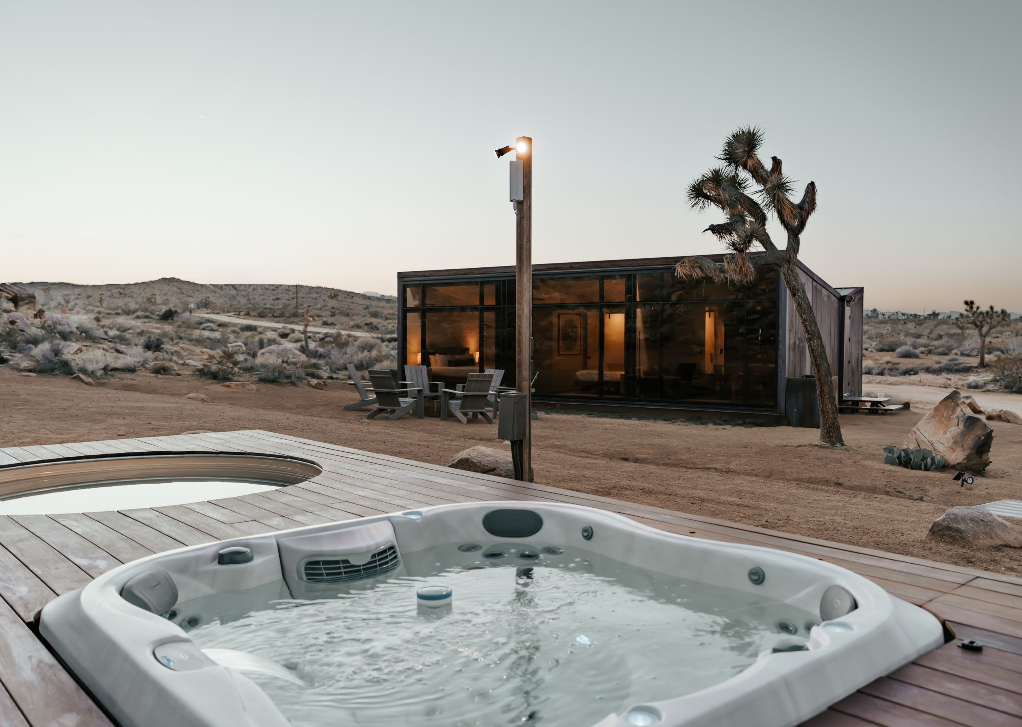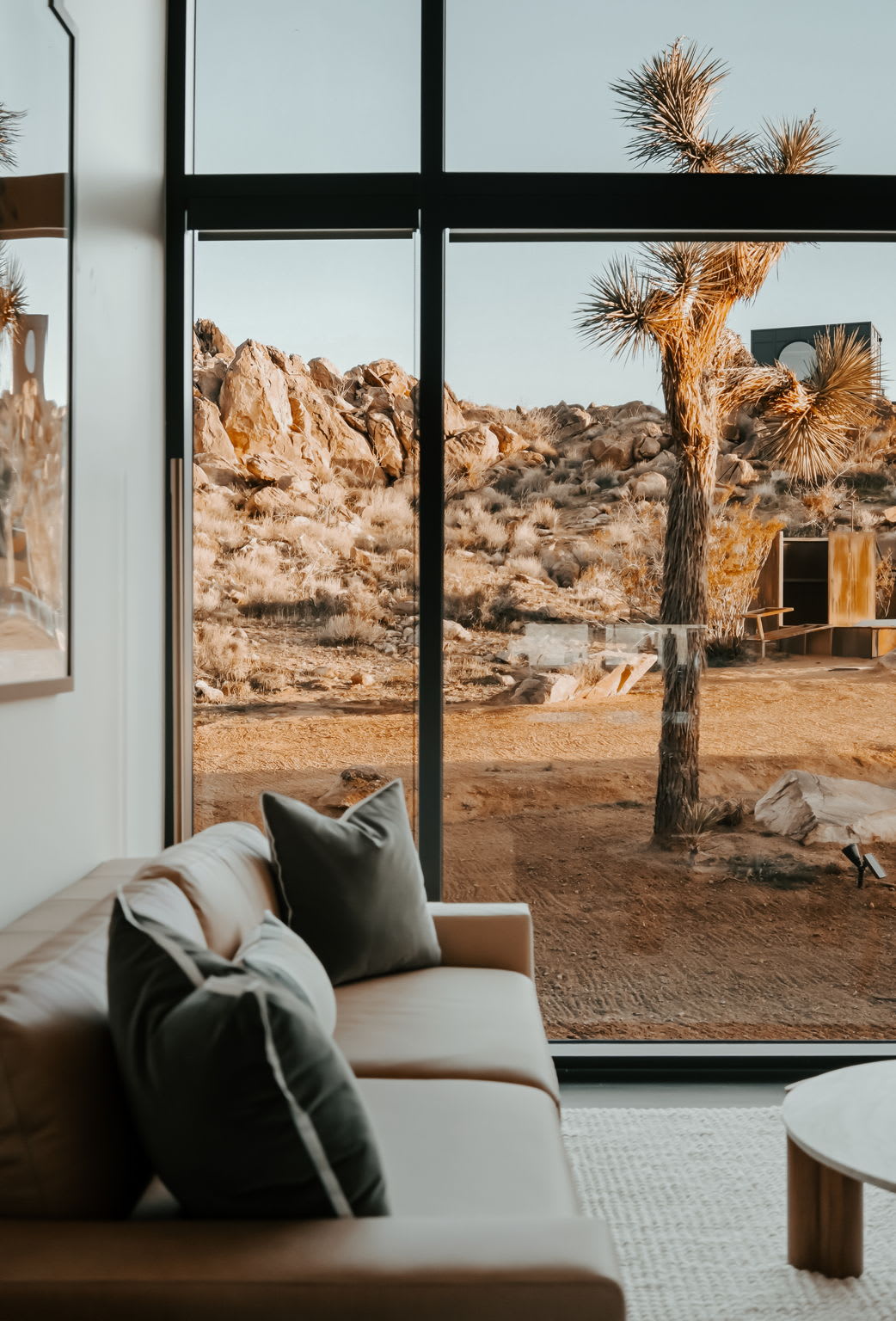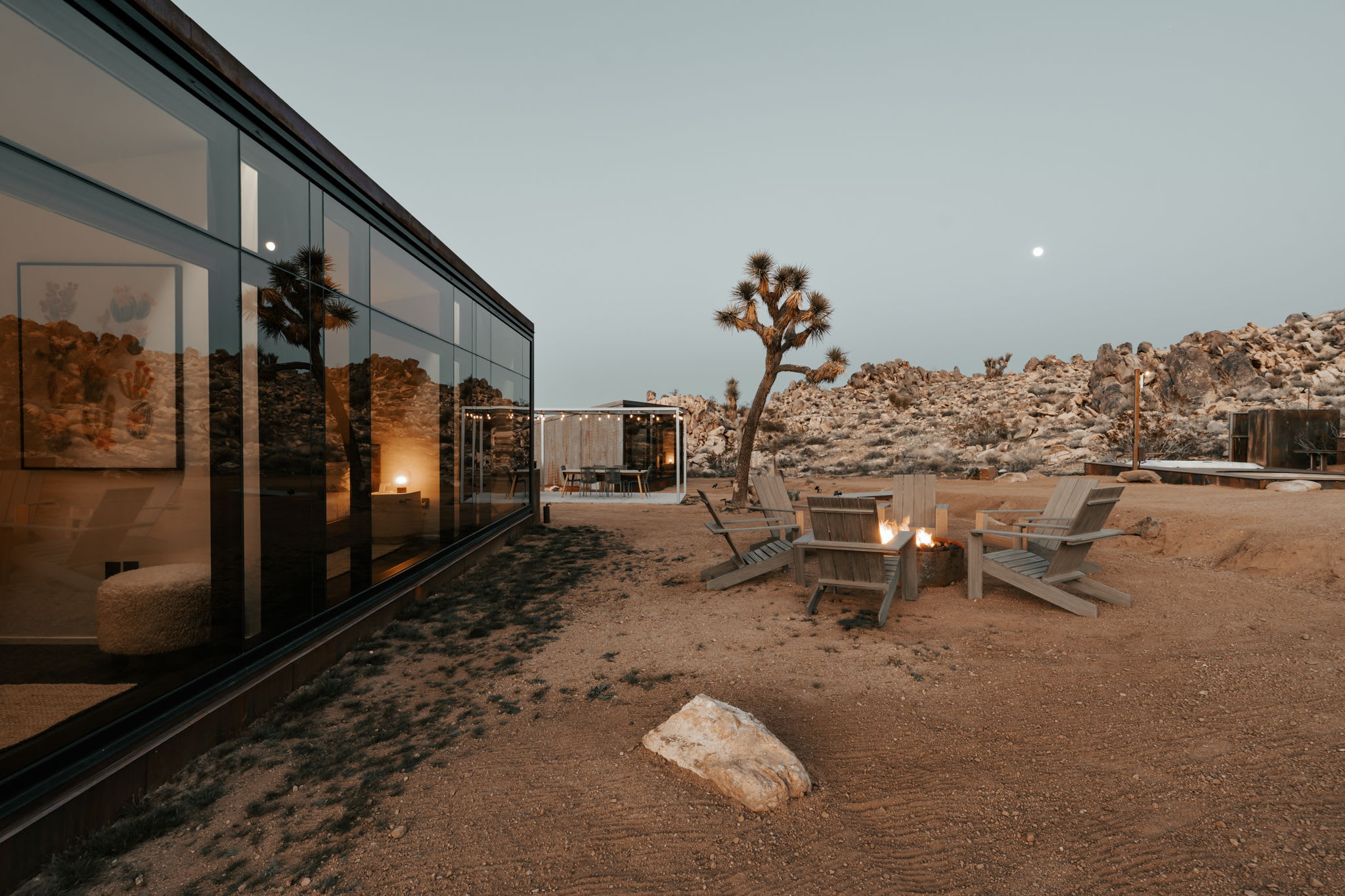 Welcome to Reflections by Homestead Modern - a serene desert sanctuary where glass walls mirror ancient rock formations and the stillness of Joshua Tree wraps around you. Set against the mountains and thoughtfully designed for any sized group that wants privacy, this secluded retreat invites you to slow down, reconnect, and soak in the beauty of the High Desert. From stargazing soaks to sunrise yoga in the glass studio perched in the boulders, Reflections is an immersive escape into nature and quiet luxury.