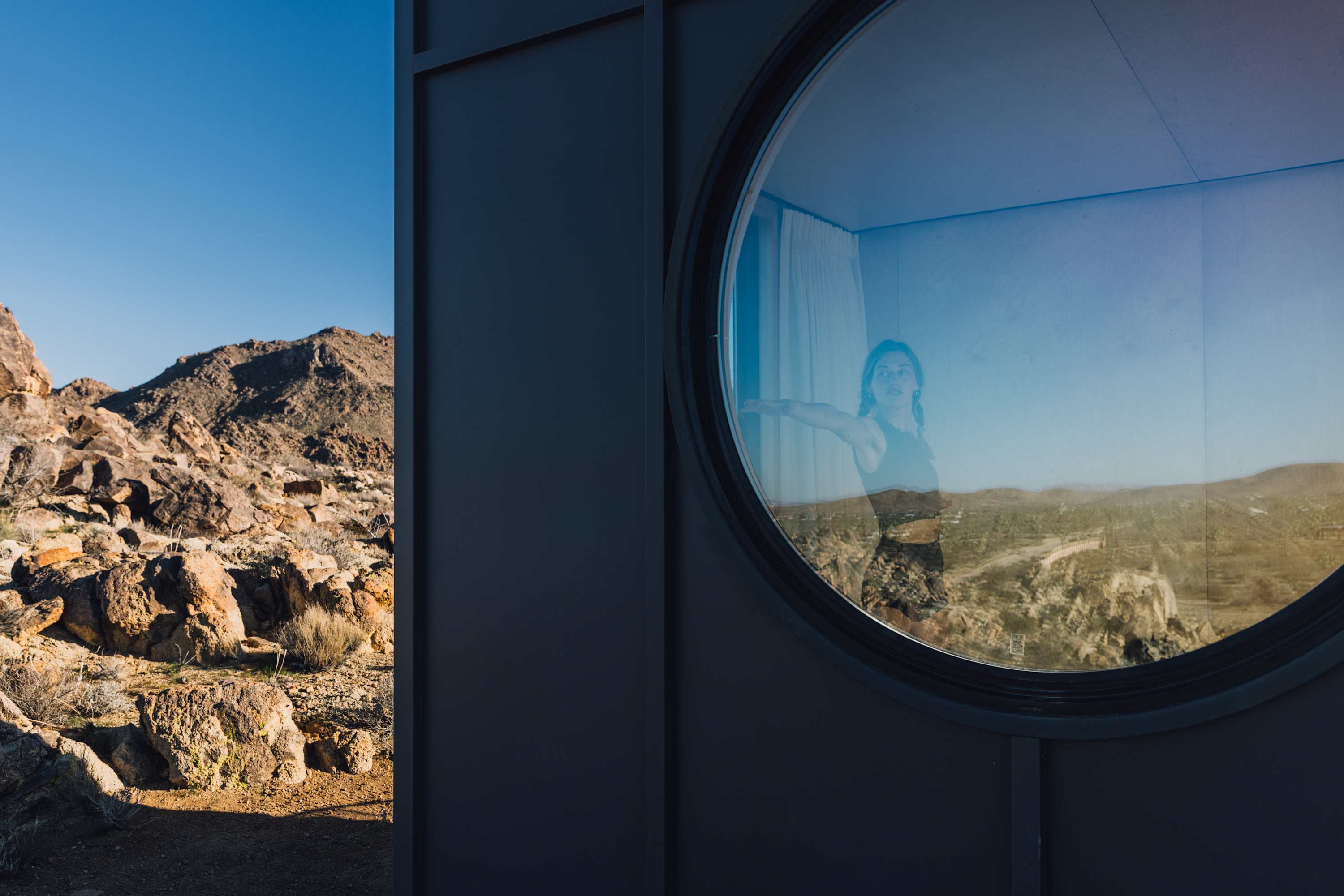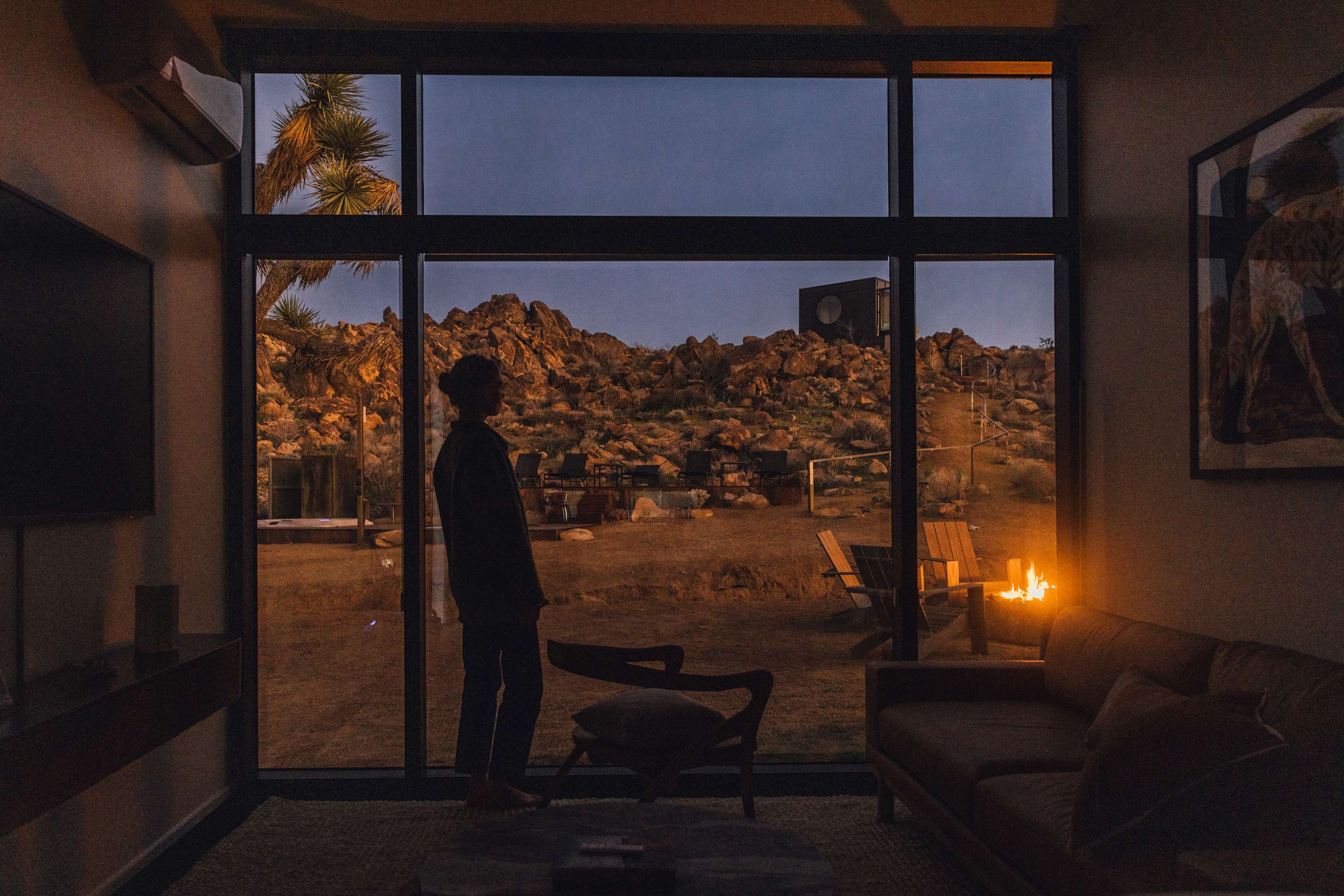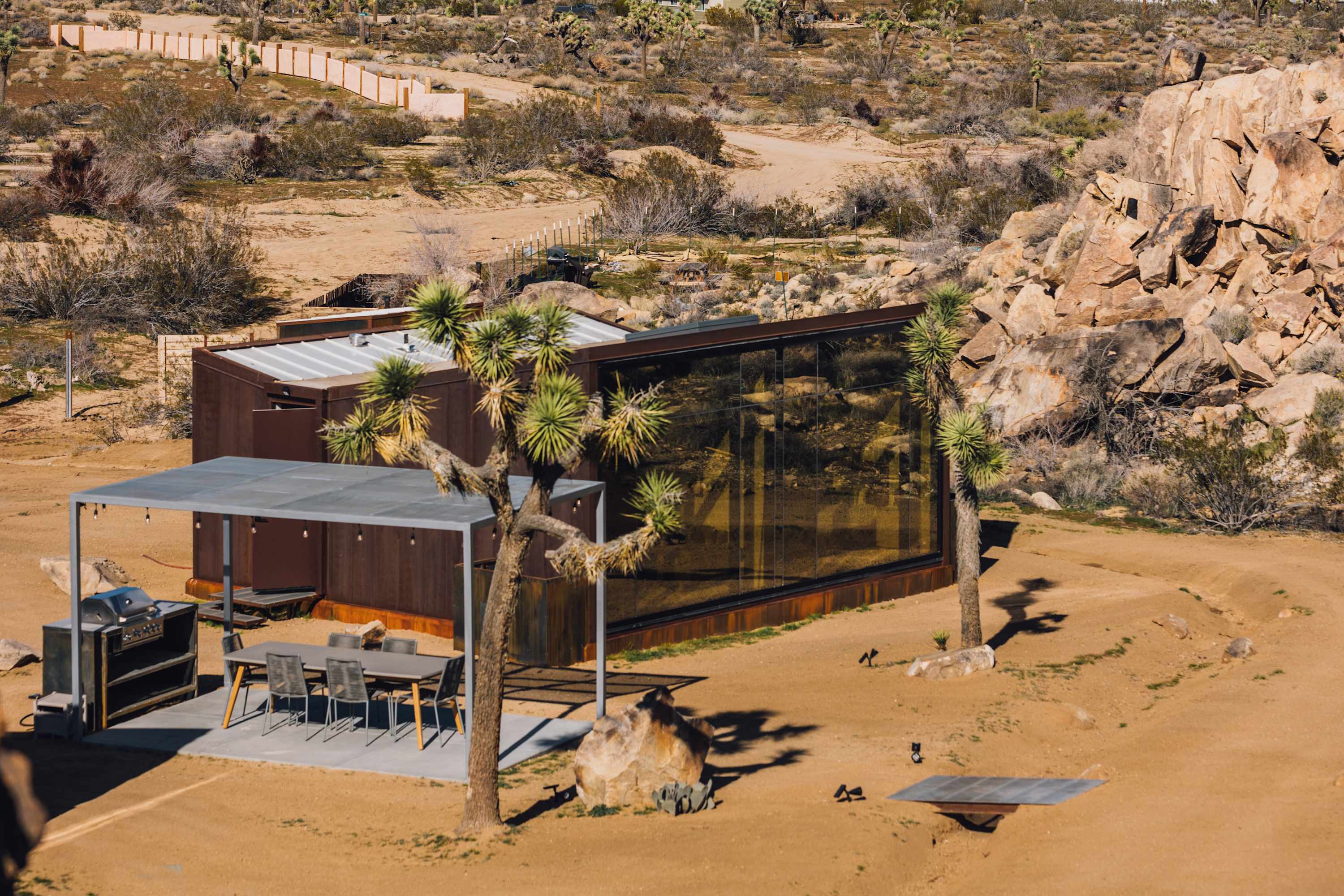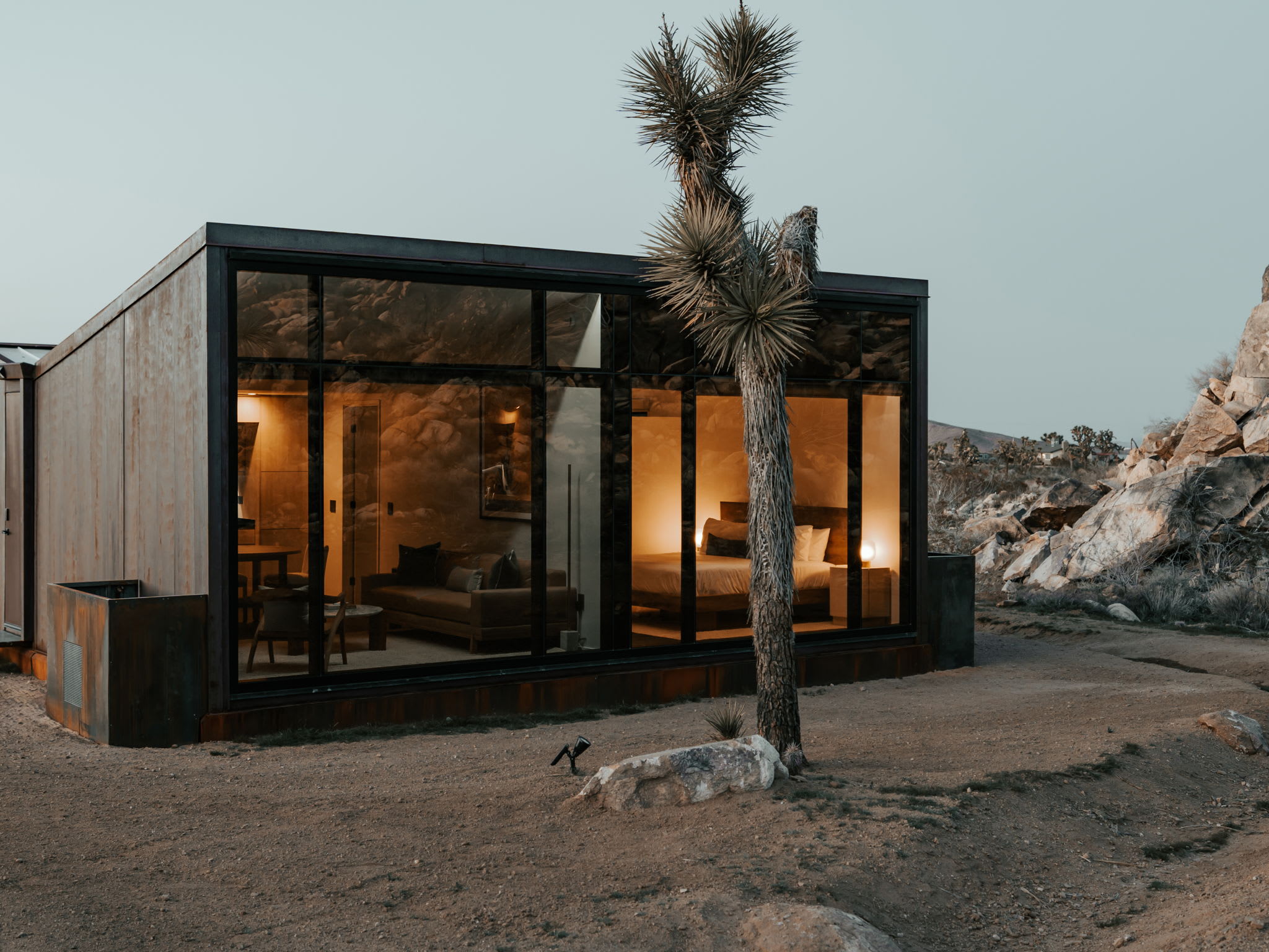 Welcome to Reflections by Homestead Modern - a serene desert sanctuary where glass walls mirror ancient rock formations and the stillness of Joshua Tree wraps around you. Set against the mountains and thoughtfully designed for any sized group that wants privacy, this secluded retreat invites you to slow down, reconnect, and soak in the beauty of the High Desert. From stargazing soaks to sunrise yoga in the glass studio perched in the boulders, Reflections is an immersive escape into nature and quiet luxury.
