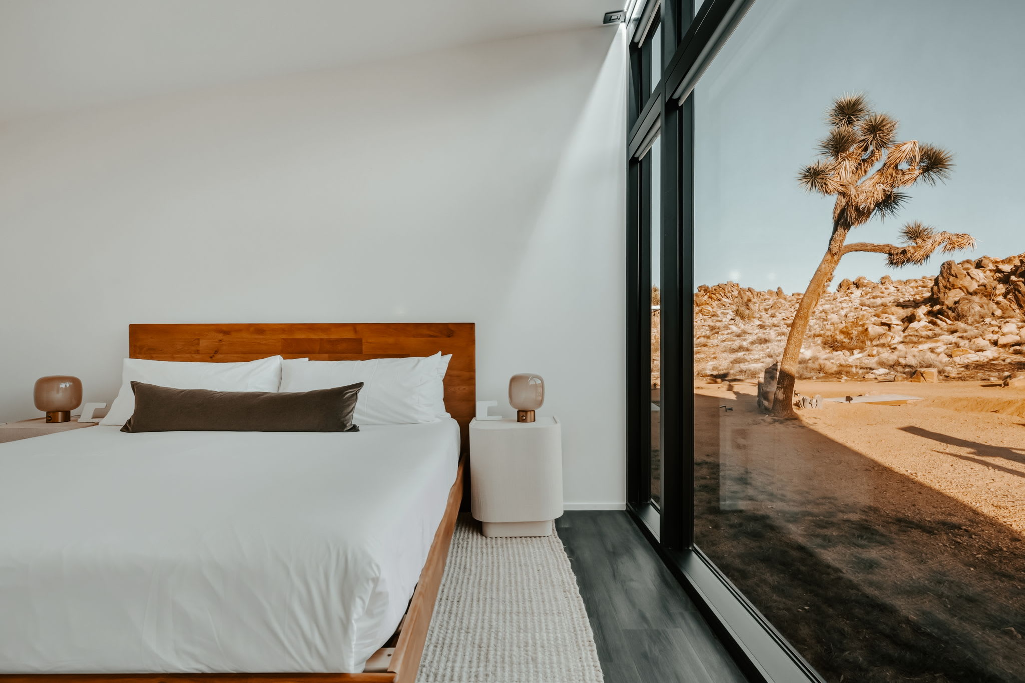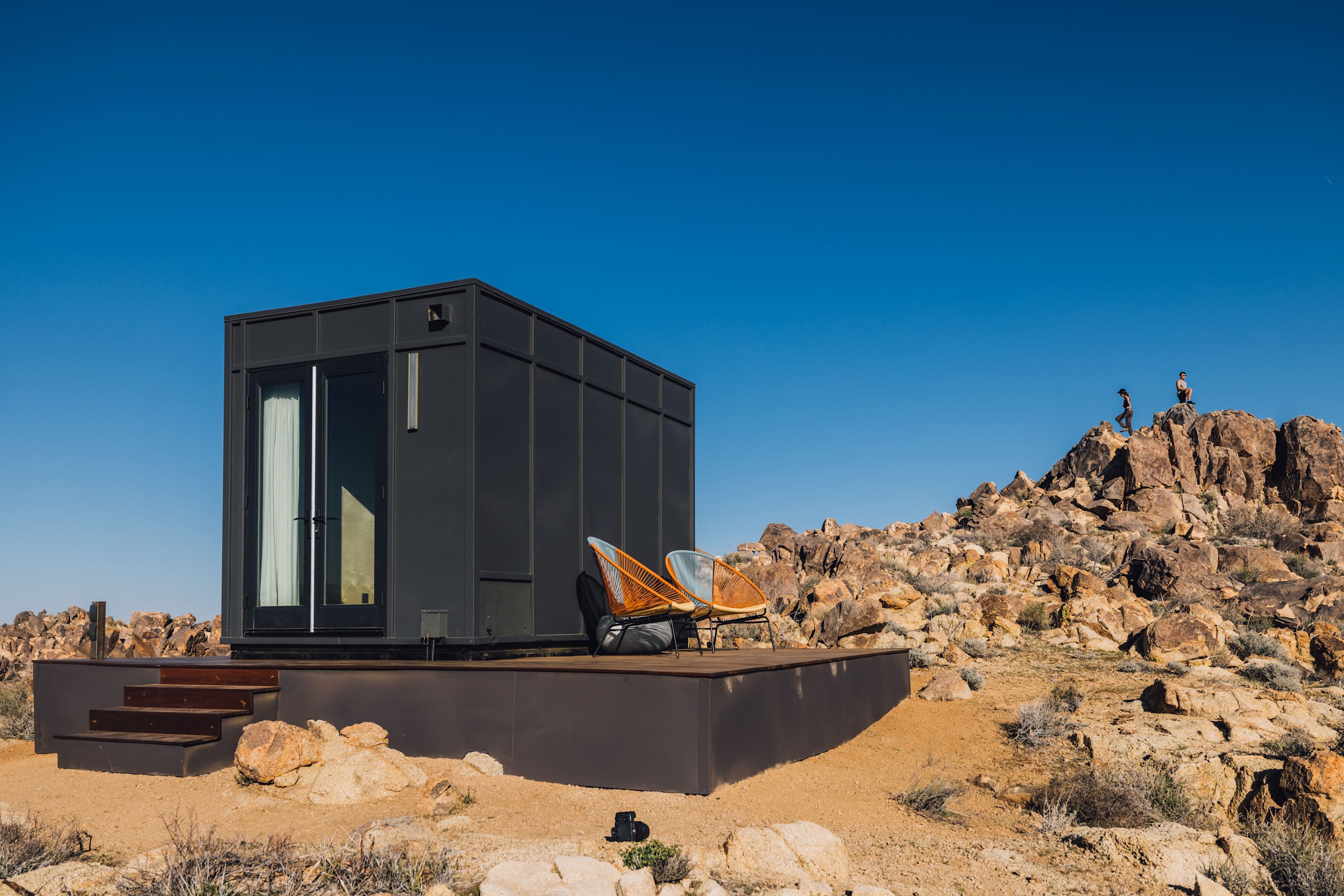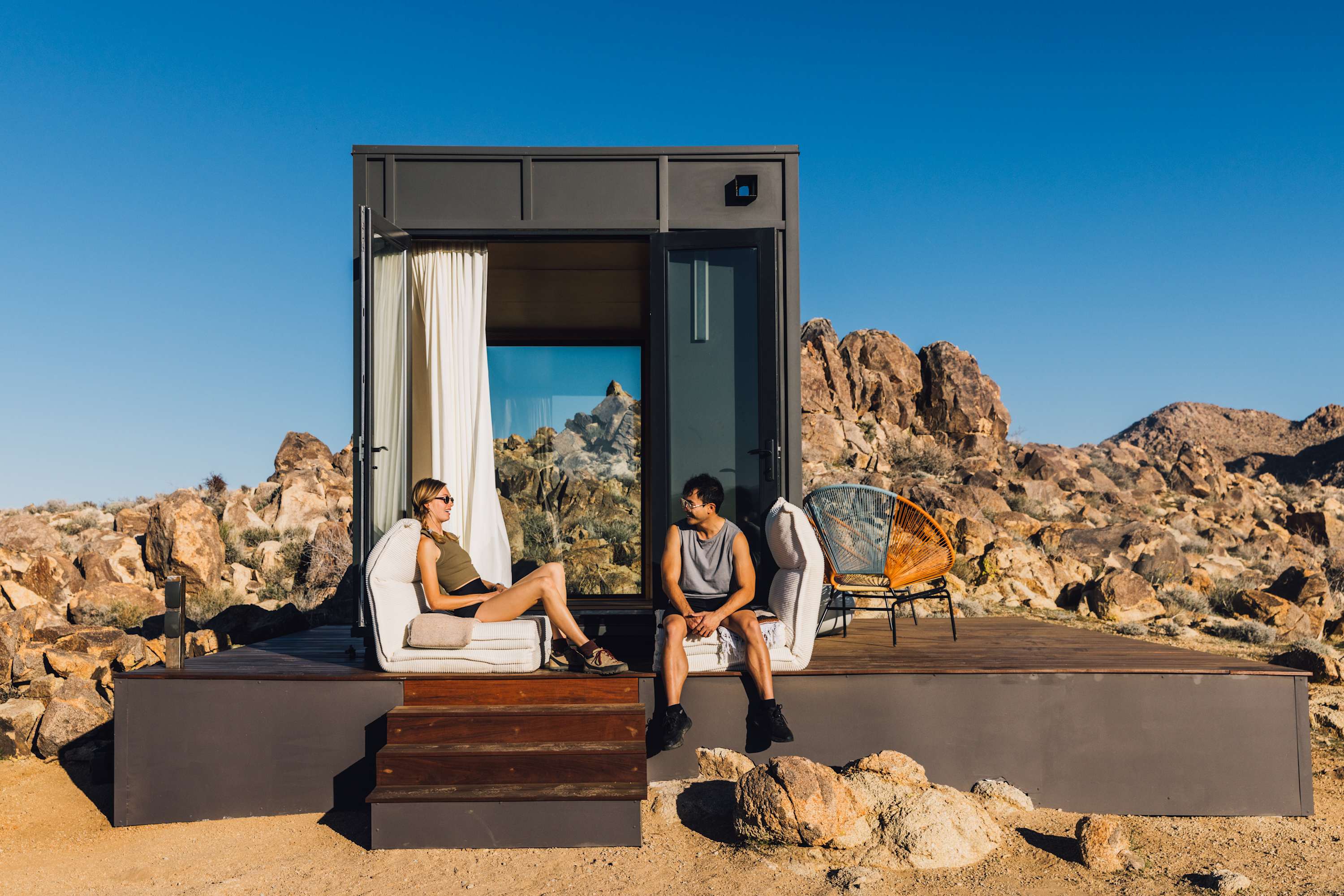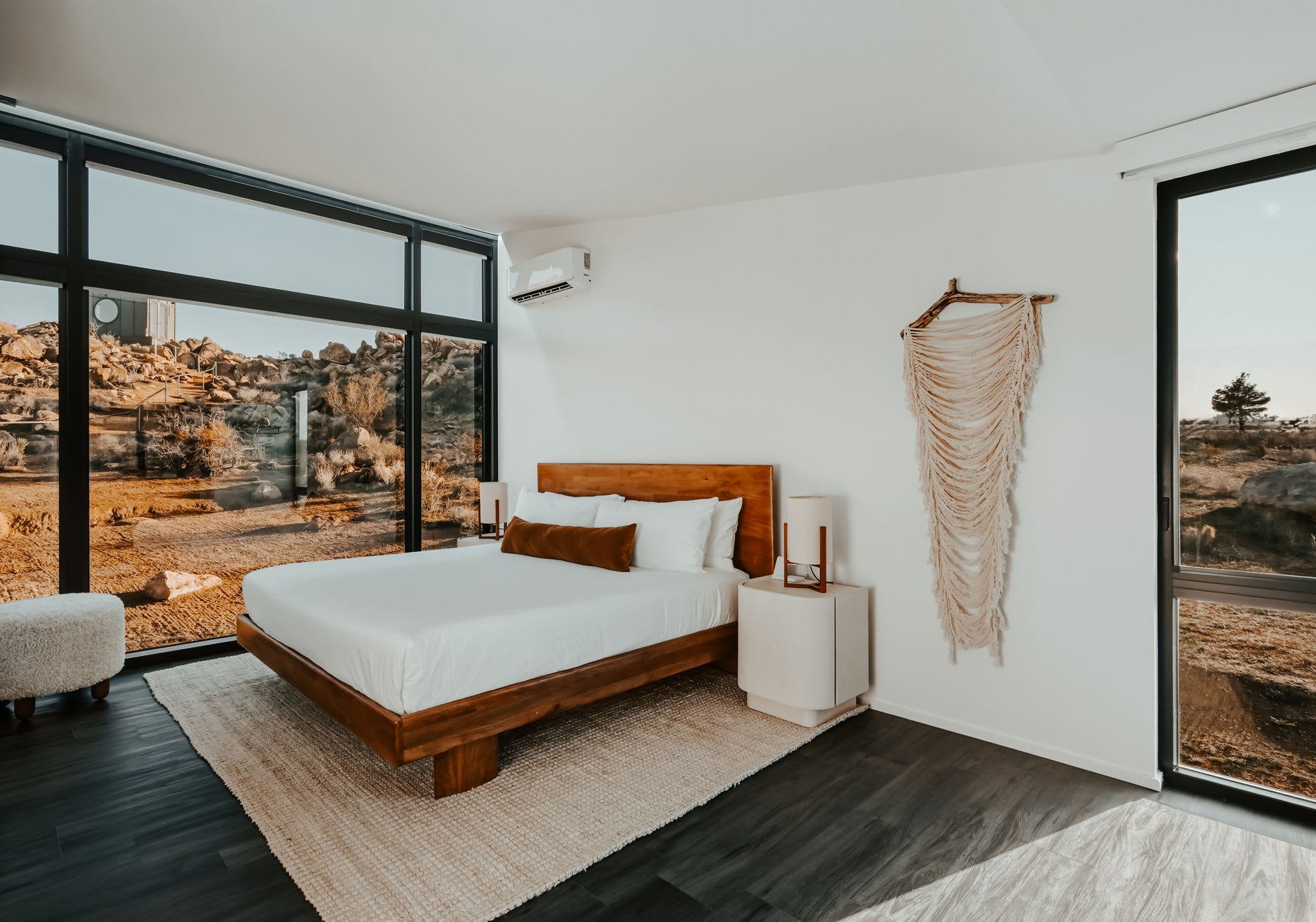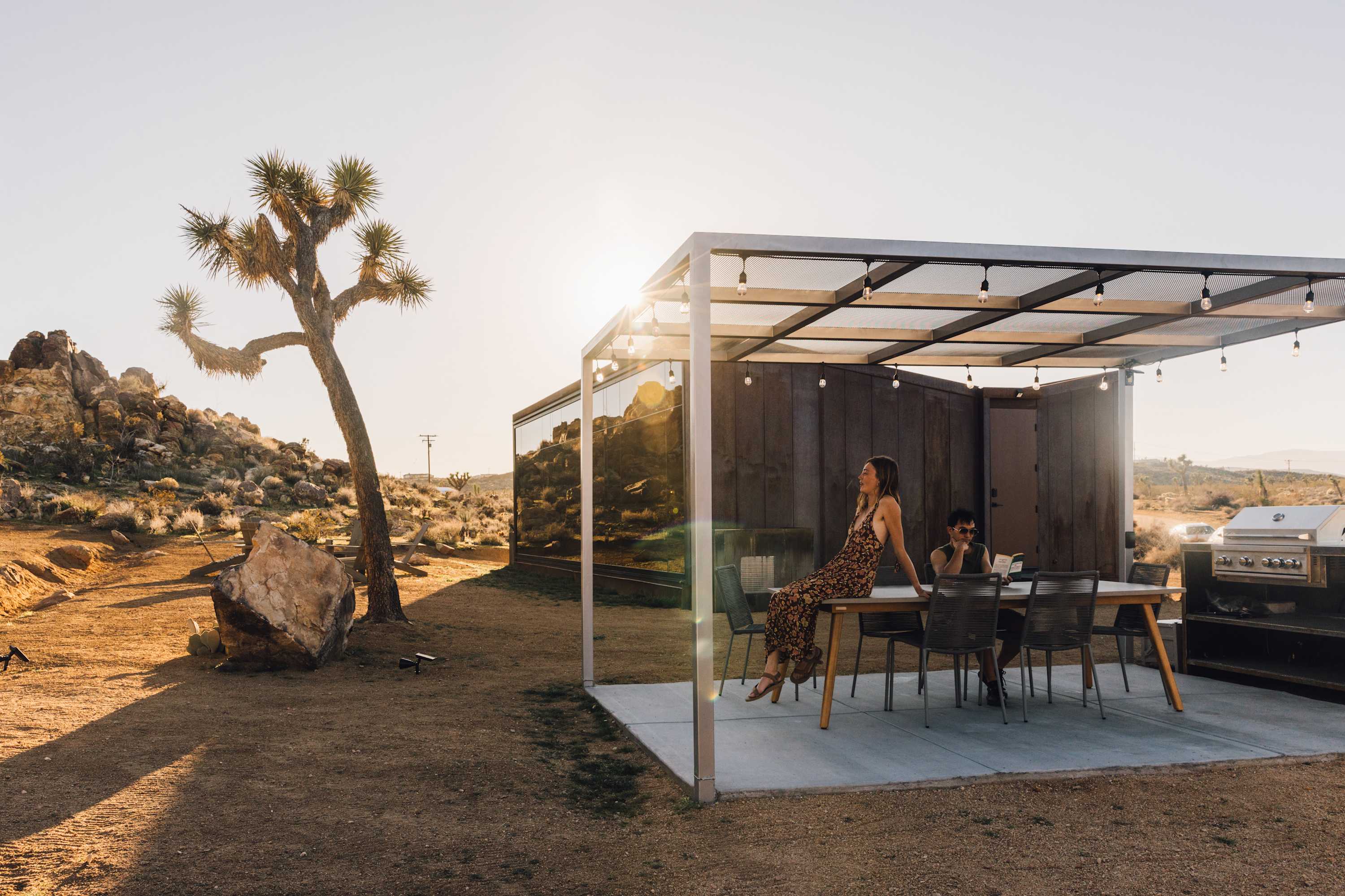 Nestled at the base of a boulder-filled mountain in a peaceful pocket of the High Desert, Reflections by Homestead Modern blends modern design with soulful desert surroundings. The listing includes the 2BR house and a 1BR house on one property, making it an ideal destination for groups seeking space, comfort, and connection without sacrificing privacy.