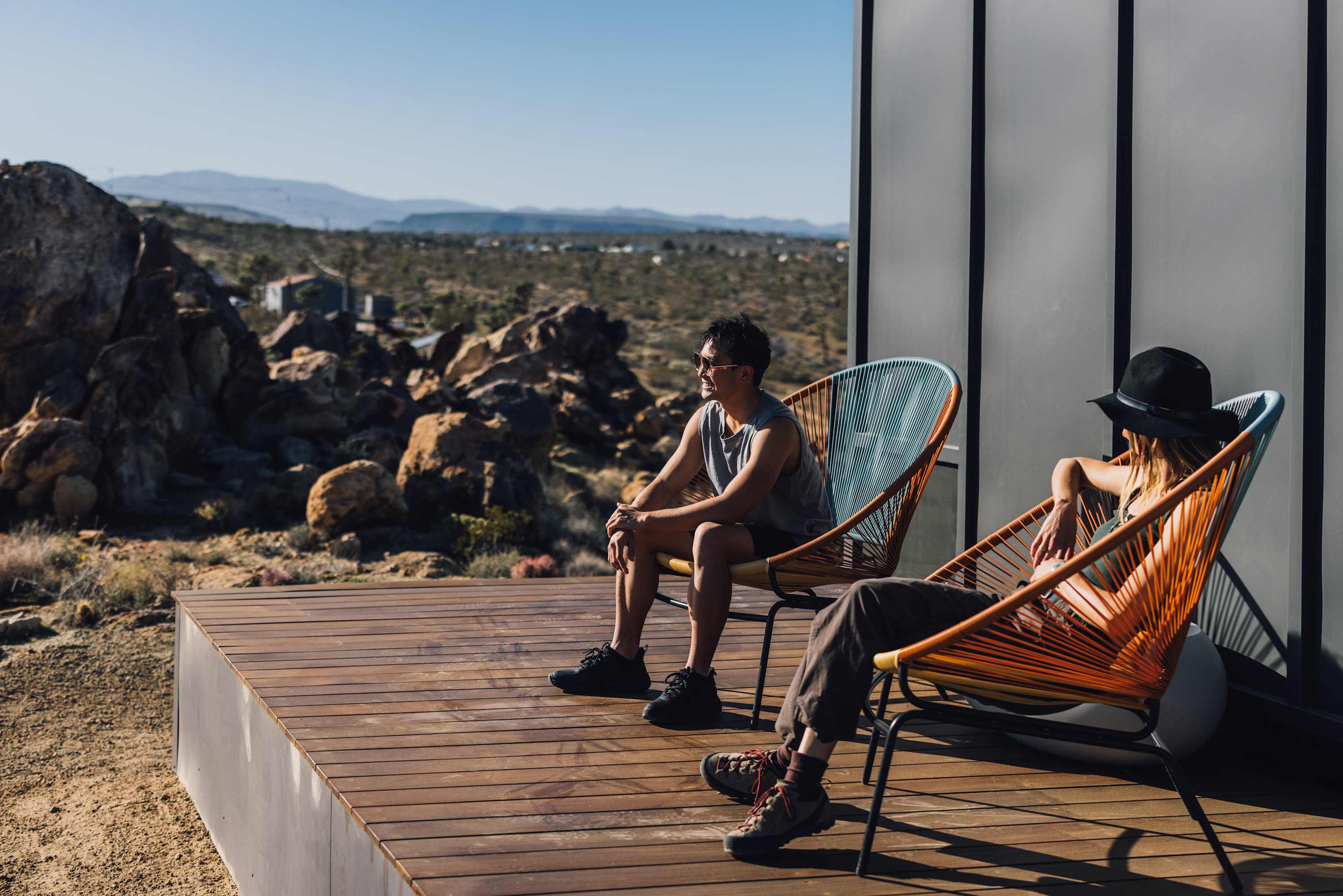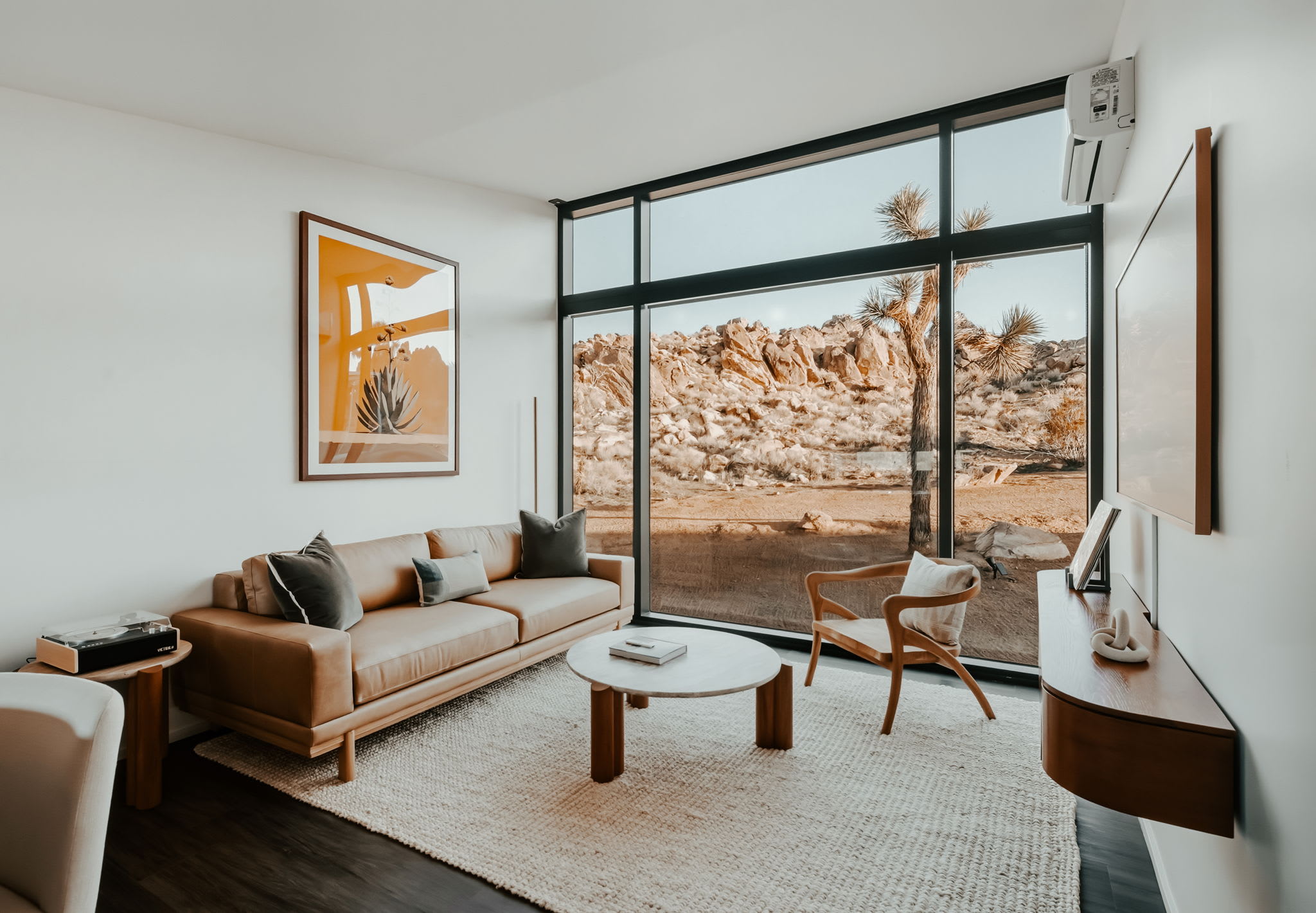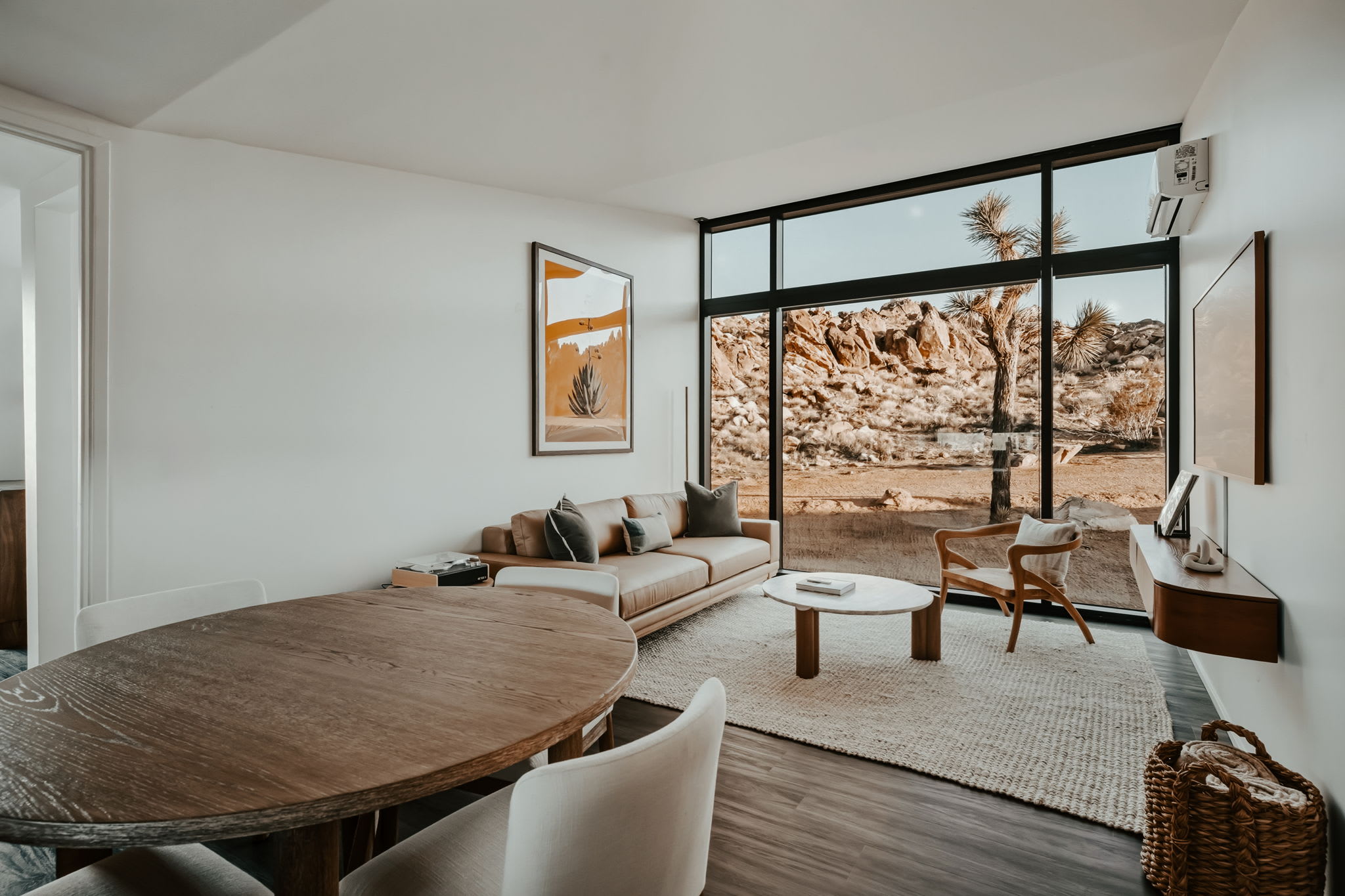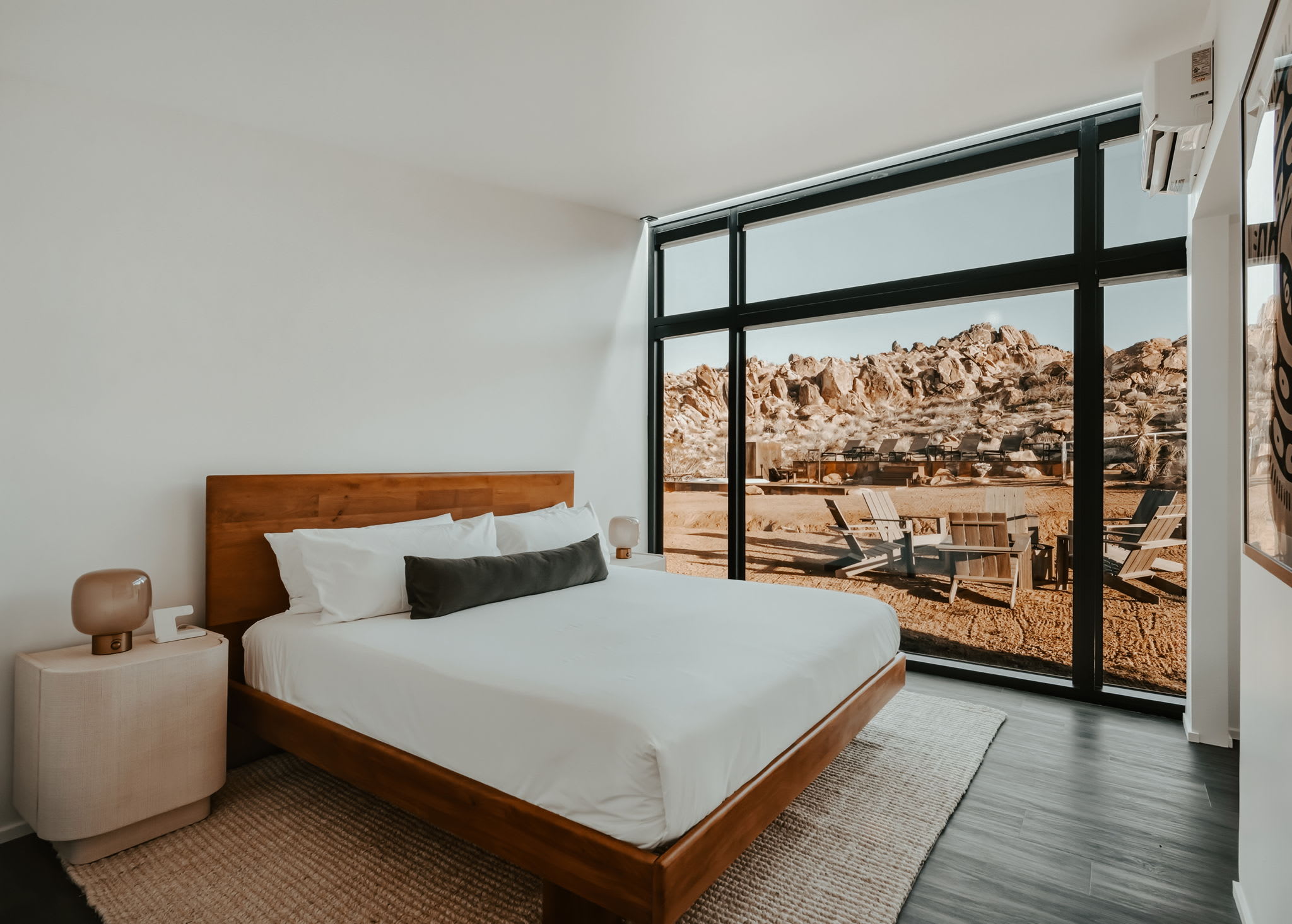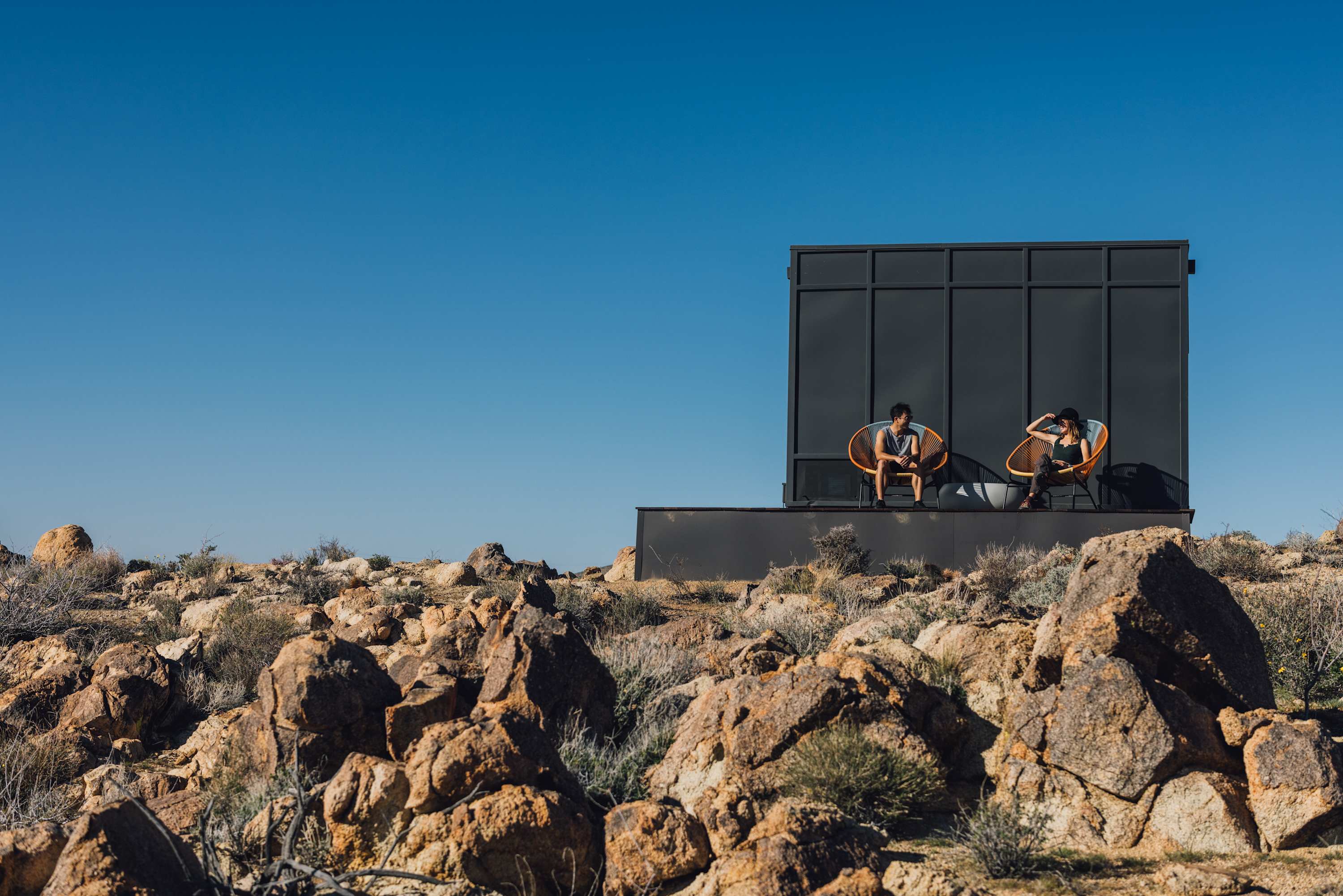 Nestled at the base of a boulder-filled mountain in a peaceful pocket of the High Desert, Reflections by Homestead Modern blends modern design with soulful desert surroundings. The listing includes the 2BR house and a 1BR house on one property, making it an ideal destination for groups seeking space, comfort, and connection without sacrificing privacy.