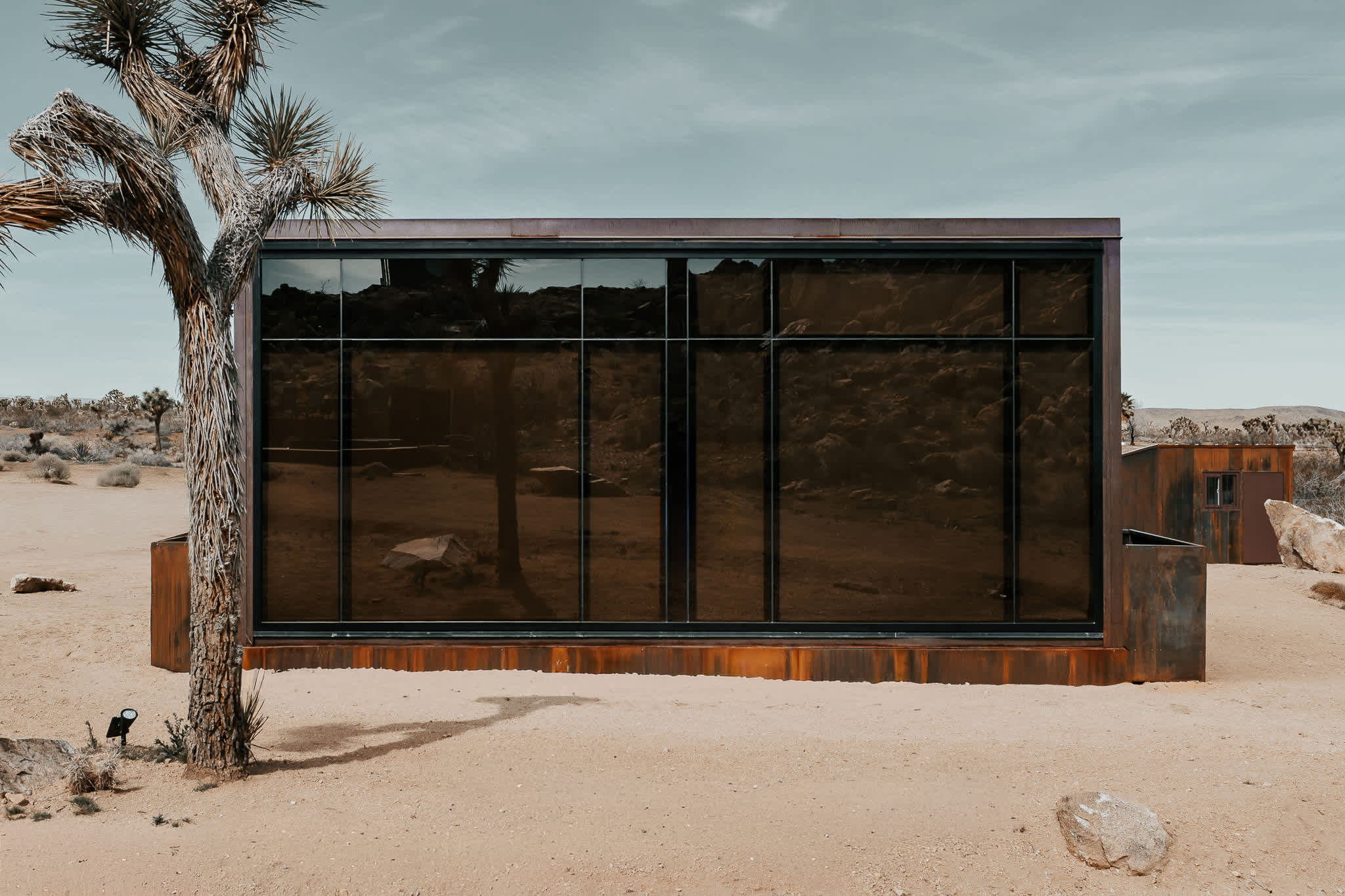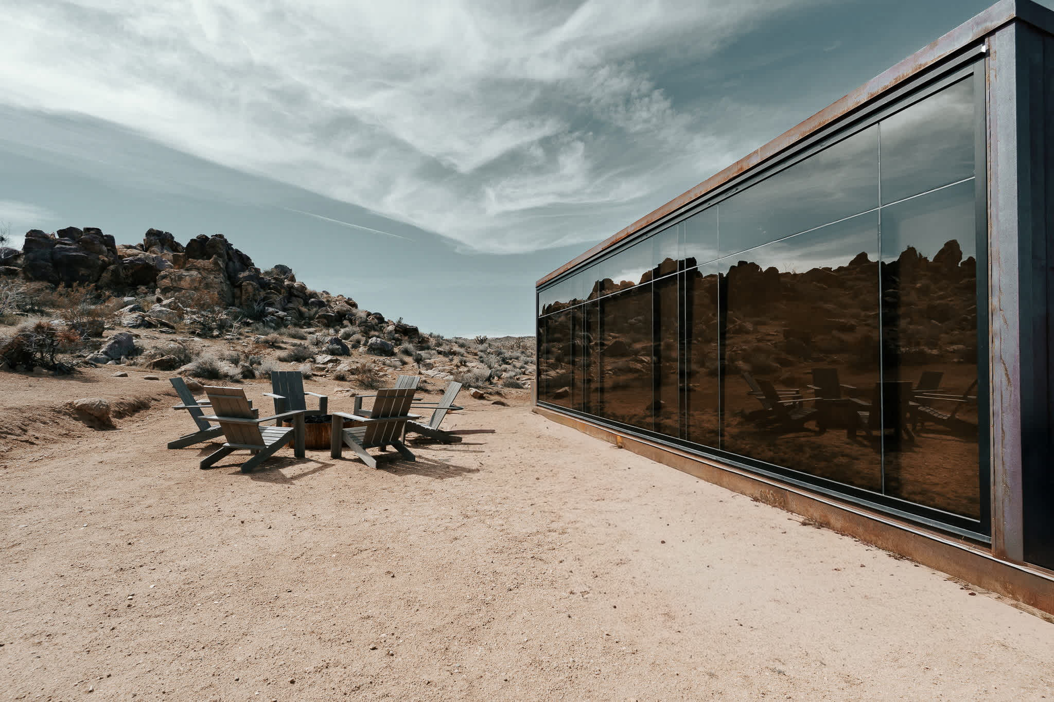 Welcome to Reflections by Homestead Modern - a serene desert sanctuary where glass walls mirror ancient rock formations and the stillness of Joshua Tree wraps around you. Set against the mountains and thoughtfully designed for any sized group that wants privacy, this secluded retreat invites you to slow down, reconnect, and soak in the beauty of the High Desert. From stargazing soaks to sunrise yoga in the glass studio perched in the boulders, Reflections is an immersive escape into nature and quiet luxury.