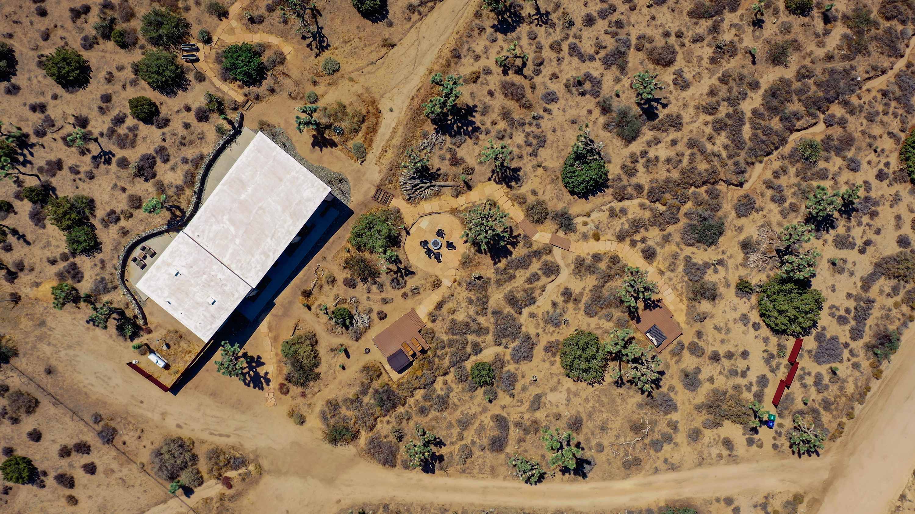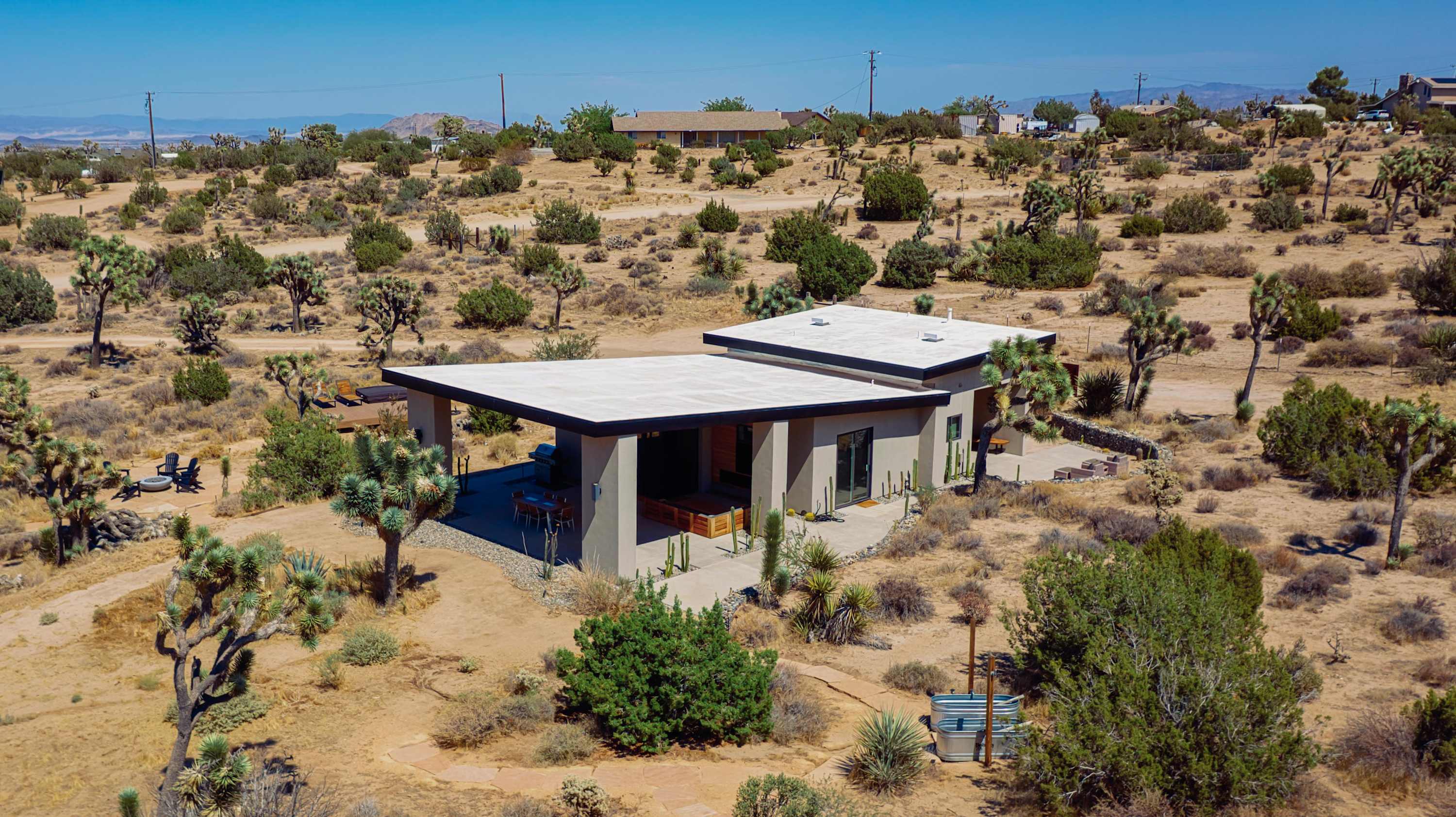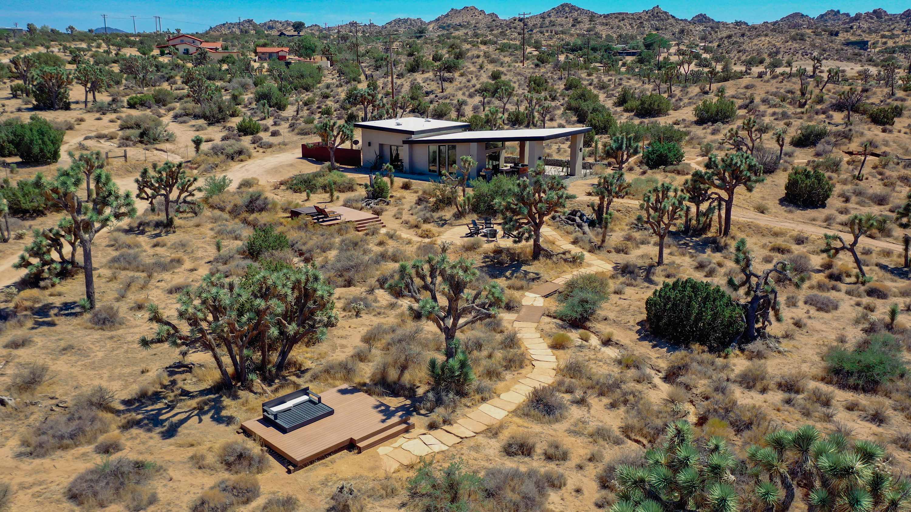 The exterior is designed as a series of "rooms" that flow naturally into the boulders and Joshua Trees.